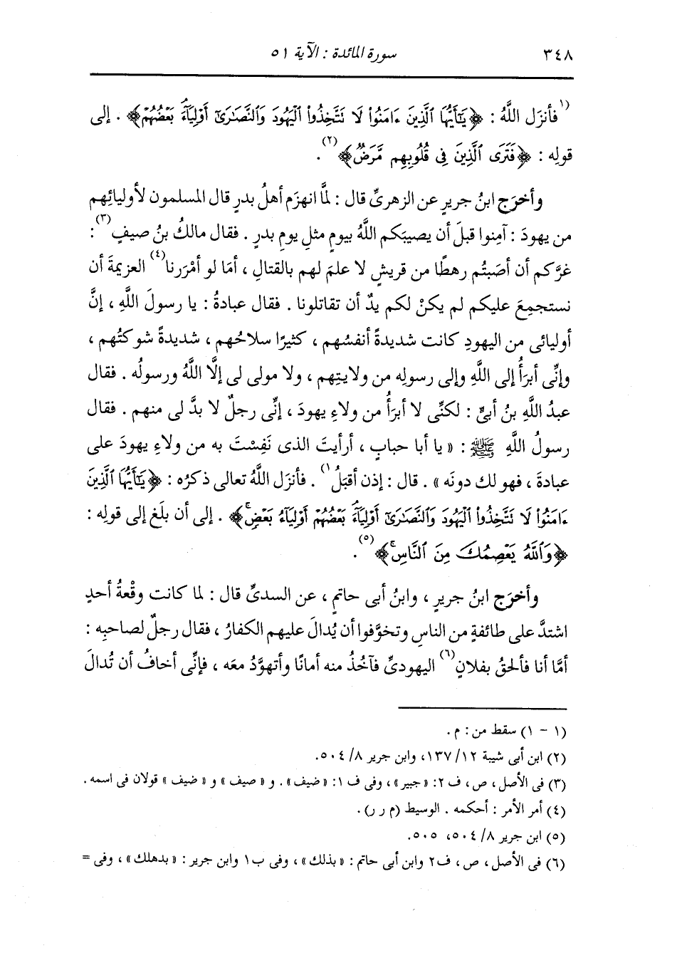 وأخرج ابن أبي شيبة ، وَابن جَرِير عن عطية بن سعد قال جاء عبادة بن الصامت من بني الحارث بن الخزرج إلى رسول الله صلى الله عليه وسلم فقال : يارسول الله ان لي موالي من يهود كثير عددهم واني أبرأ إلى الله ورسوله من ولاية يهود وأتولى الله ورسوله فقال عبد الله بن أبي : اني رجل أخاف الدوائر لا أبرأ من ولاية موالي ، فقال رسول الله صلى الله عليه وسلم لعبد الله بن أبي : يا أبا حباب أرأيت الذي نفست به من ولاء يهود على عبادة ، فهو لك دونه ، قال : إذن أقبل
