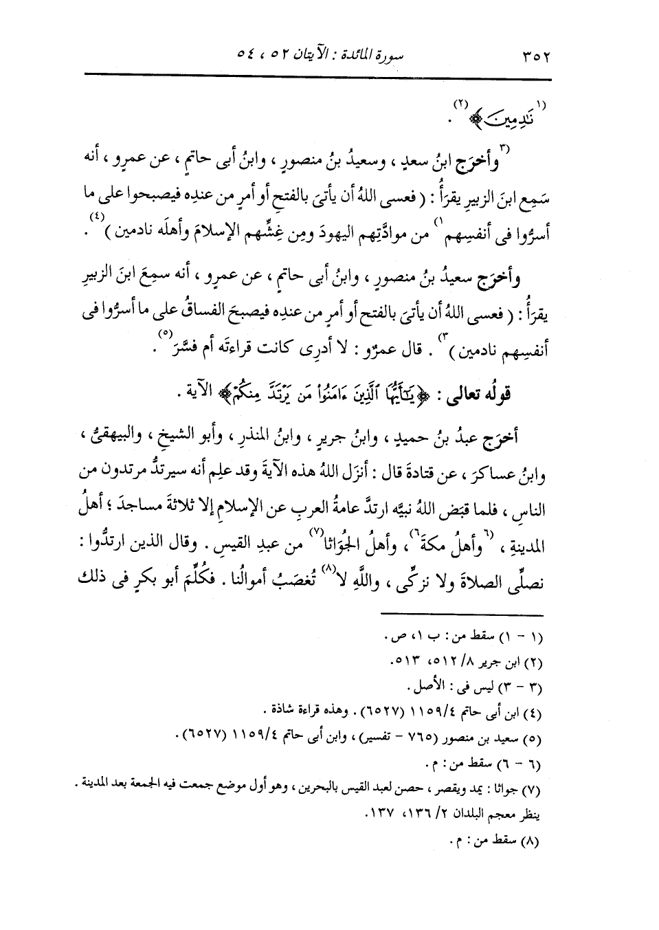 وأخرج عَبد بن حُمَيد ، وَابن جَرِير ، وَابن المنذر ، وَابن أبي حاتم وأبو الشيخ عن مجاهد {فترى الذين في قلوبهم مرض يسارعون فيهم} قال : هم المنافقون في مصانعة اليهود وملاحاتهم واسترضاعهم أولادهم اياهم {يقولون نخشى} ان تكون الدائرة لليهود بالفتح حينئذ {فعسى الله أن يأتي بالفتح} على الناس عامة {أو أمر من عنده} خاصة للمنافقين {فيصبحوا} المنافقون {على ما أسروا في أنفسهم} من شأن يهود {نادمين}.