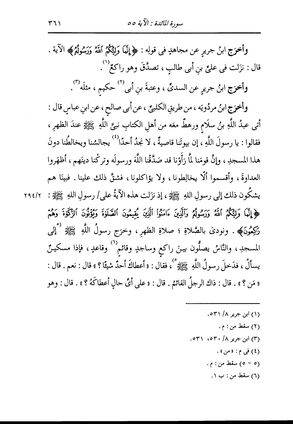 وأخرج أبو الشيخ ، وَابن مردويه عن علي بن أبي طالب قال نزلت هذه الآية على رسول الله صلى الله عليه وسلم في بيته {إنما وليكم الله ورسوله والذين} إلى آخر الآية ، فخرج رسول الله صلى الله عليه وسلم فدخل المسجد جاء والناس يصلون بين راكع وساجد وقائم يصلي فاذا سائل فقال : ياسائل هل أعطاك أحد شيئا قال : لا إلا ذاك الراكع - لعلي بن أبي طالب - أعطاني خاتمه.