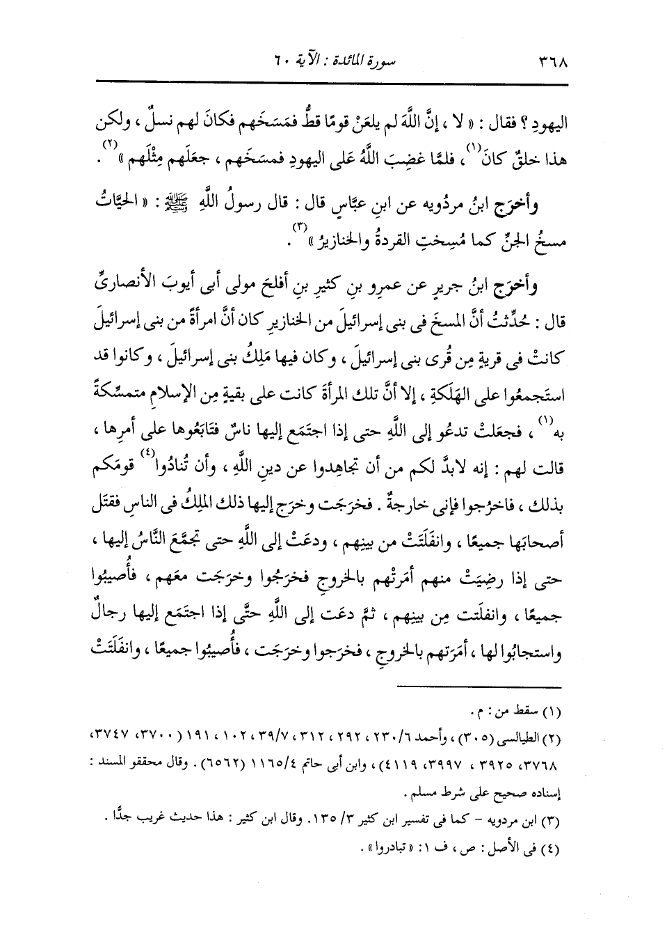 وأخرج الطيالسي وأحمد ، وَابن أبي حاتم وأبو الشيخ ، وَابن مردويه عن ابن مسعود قال سألنا رسول الله صلى الله عليه وسلم عن القردة والخنازير أهي من نسل