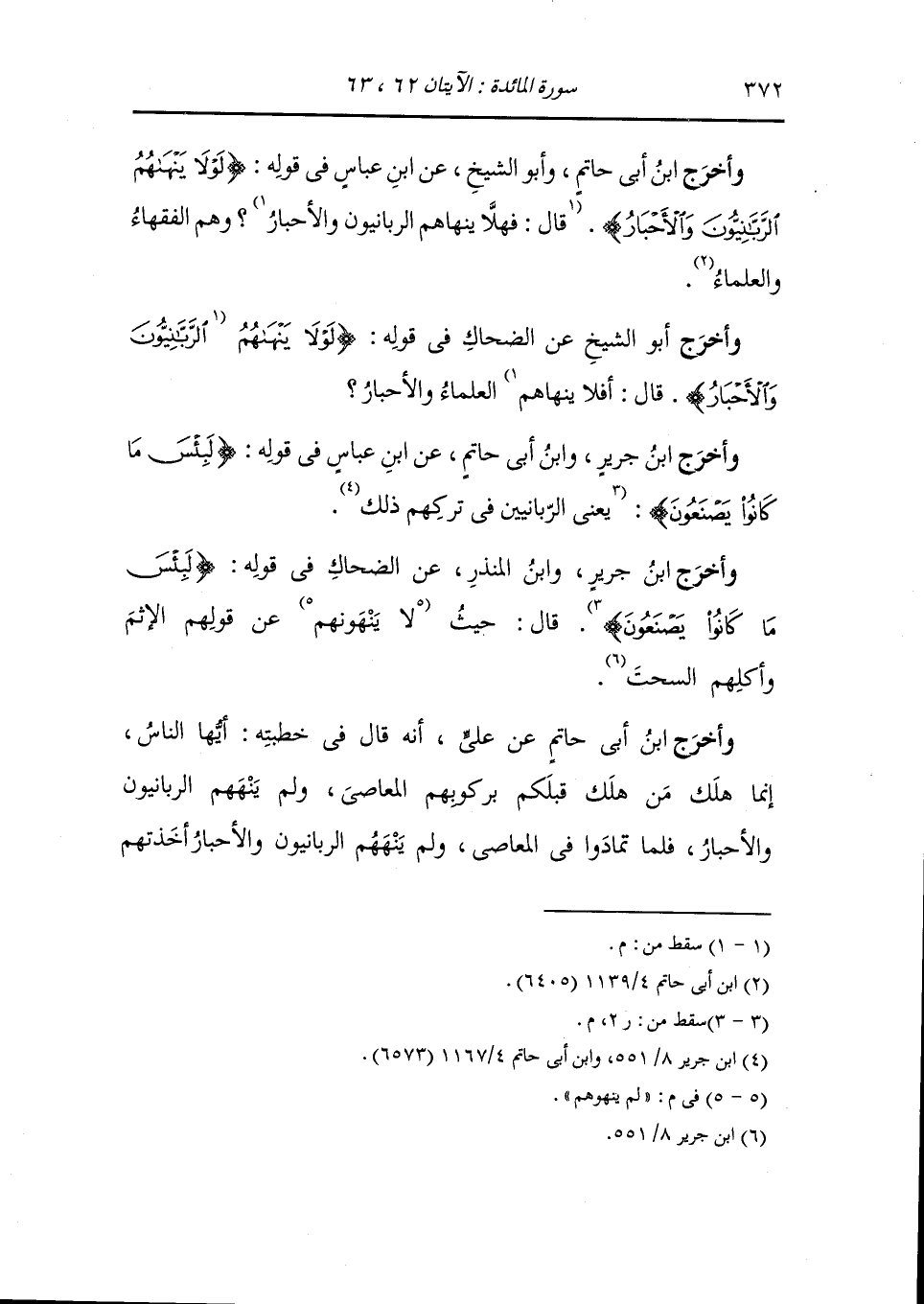 أَخْرَج ابن جرير ، وَابن أبي حاتم عن ابن زيد في قوله {وترى كثيرا منهم يسارعون في الإثم والعدوان} قال : هؤلاء اليهود {لبئس ما كانوا يعملون لولا ينهاهم الربانيون} إلى قوله {لبئس ما كانوا يصنعون} ويعملون واحد ، قال : هؤلاء لم ينهوا كما قال لهؤلاء حين عملوا.