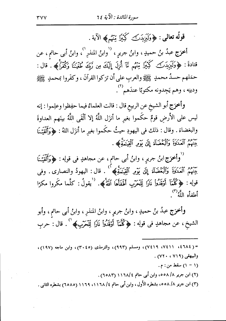 وأخرج عَبد بن حُمَيد ، وَابن جَرِير ، وَابن أبي حاتم عن قتادة {وليزيدن كثيرا منهم ما أنزل إليك من ربك طغيانا وكفرا} قال : حملهم حسد محمد والعرب على أن تركوا القرآن وكفروا بمحمد ودينه وهم يجدونه عندهم مكتوبا.