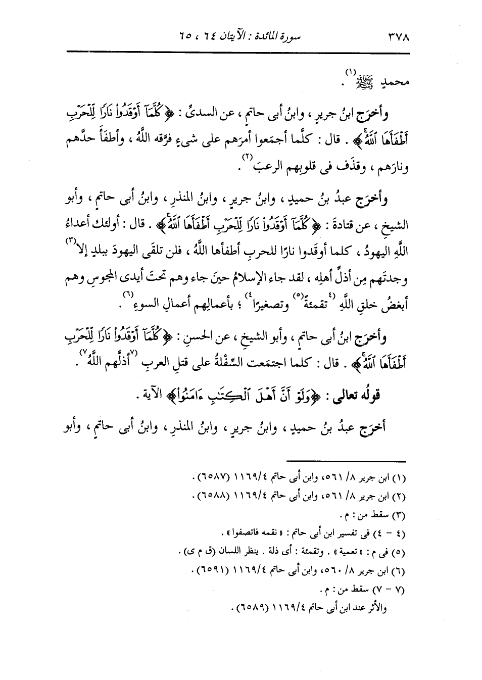 وأخرج عَبد بن حُمَيد ، وَابن جَرِير ، وَابن أبي حاتم ، وَابن المنذر وأبو الشيخ عن قتادة {كلما أوقدوا نارا للحرب أطفأها الله} قال : أولئك أعداء الله اليهود كلما أوقدوا نارا للحرب أطفأها الله فلن تلقى اليهود ببلد إلا وجدتهم من أذل أهله لقد جاء الإسلام حين جاء وهم تحت أيدي المجوس وهم أبغض خلق الله تعمية وتصغيرا باعمالهم أعمال السوء.