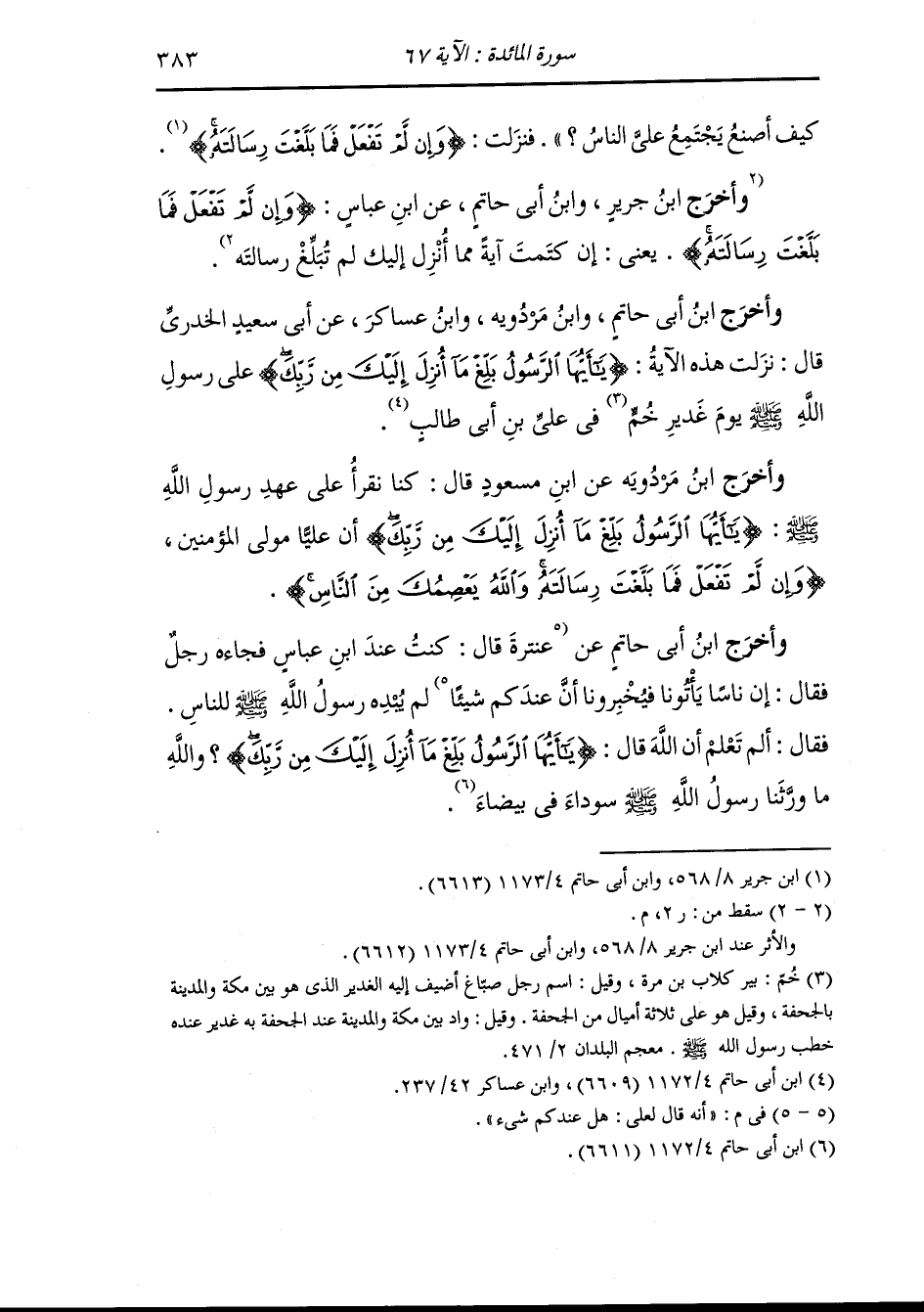 وَأخرَج ابن أبي حاتم ، وَابن مردويه ، وَابن عساكر عن أبي سعيد الخدري قال : نزلت هذه الآية {يا أيها الرسول بلغ ما أنزل إليك من ربك} على رسول الله صلى الله عليه وسلم يوم غدير خم في علي بن أبي طالب.