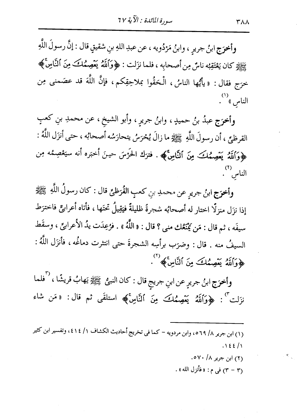 وأخرج عَبد بن حُمَيد ، وَابن جَرِير وأبو الشيخ عن محمد بن كعب القرظي ان رسول الله صلى الله عليه وسلم ما زال يحرس يحارسه أصحابه حتى أنزل الله {والله يعصمك من الناس} فترك الحرس حين اخبره انه سيعصمه من الناس.