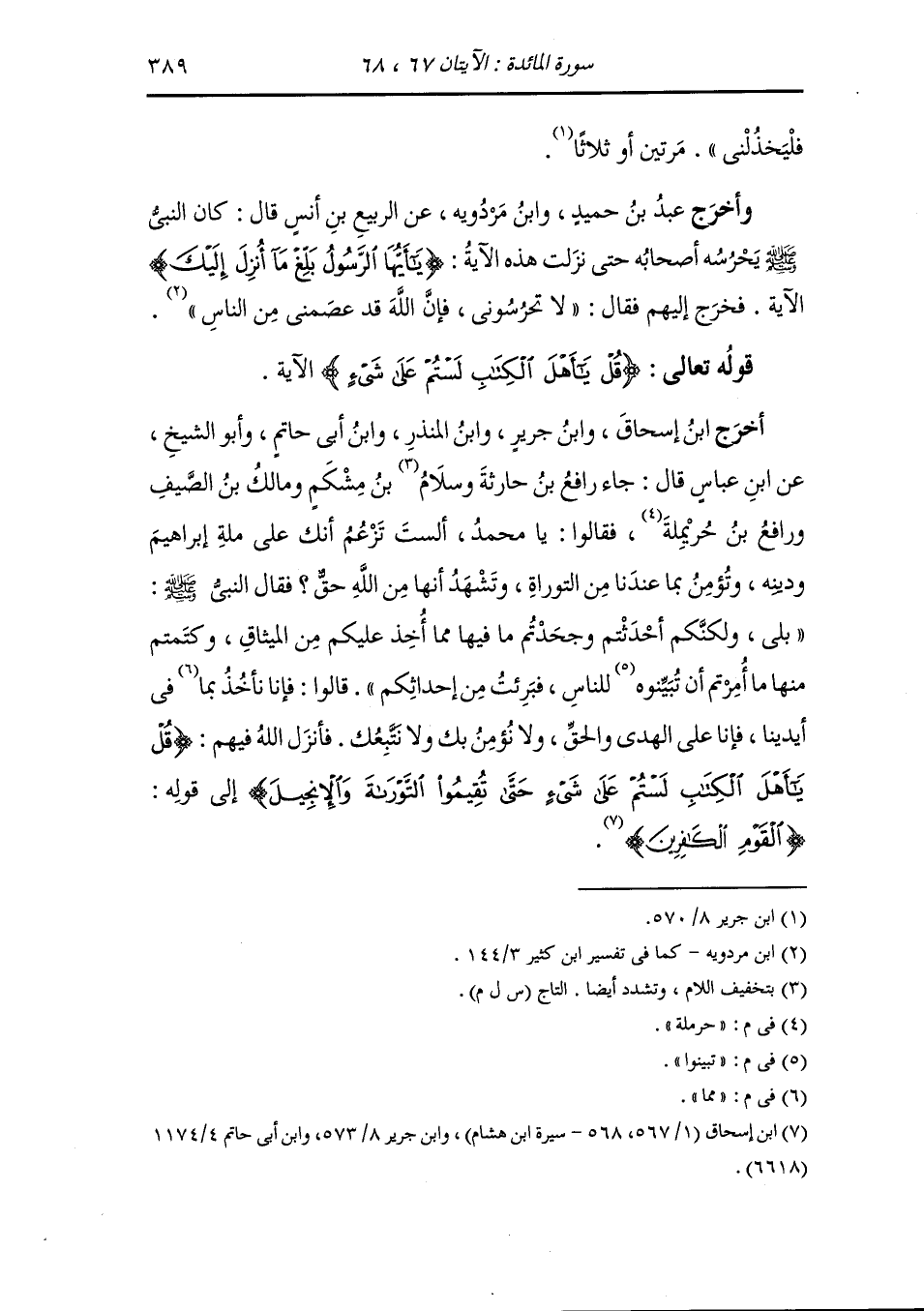 أَخْرَج ابن إسحاق ، وَابن جَرِير ، وَابن المنذر ، وَابن أبي حاتم وأبو الشيخ عن ابن عباس قال : جاء رافع بن حارثة وسلام بن مشكم ومالك بن الصيف ورافع بن حرملة قالوا : يامحمد ألست تزعم انك على ملة إبراهيم ودينه وتؤمن بما عندنا من التوراة وتشهد أنها من حق الله فقال النَّبِيّ صلى الله عليه وسلم بلى ولكنكم أحدثتم وجحدتم مافيها مما أخذ عليكم من الميثاق كتمتم منها ما أمرتم ان تبينوا للناس فبرئت من أحداثكم ، قالوا : فانا نأخذ مما في أيدينا فانا على الهدى والحق ولا نؤمن بك ولا نتبعك فأنزل الله فيهم {قل يا أهل الكتاب لستم على شيء حتى تقيموا التوراة والإنجيل} إلى قوله {القوم الكافرين}