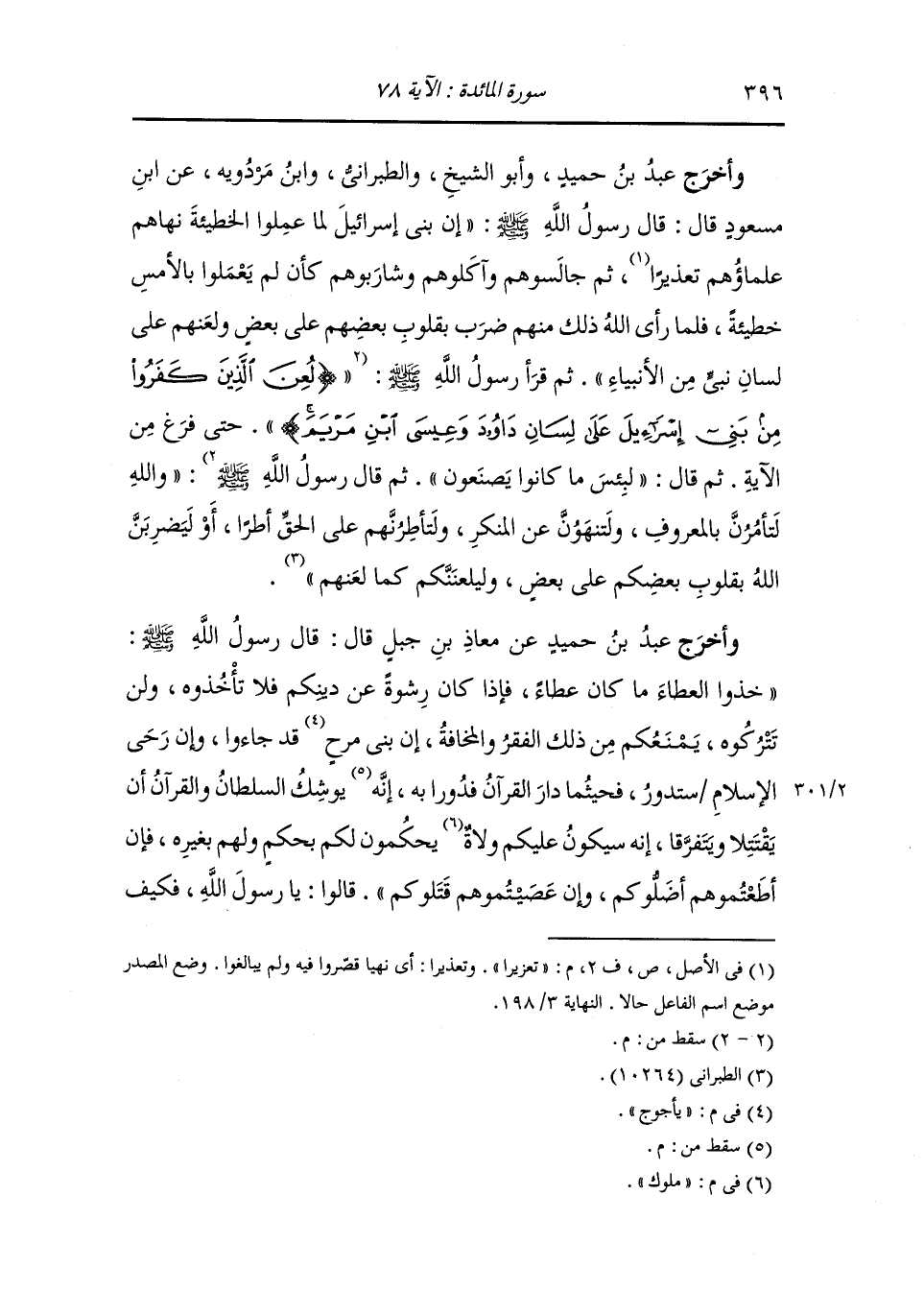 وأخرج عَبد بن حُمَيد وأبو الشيخ والطبراني ، وَابن مردويه عن ابن مسعود قال : قال رسول الله صلى الله عليه وسلم ان بني اسرئيل لما عملوا الخطيئة نهاهم علماؤهم تعزيرا ثم جالسوهم وآكلوهم وشاربوهم كأن لم يعملوا بالامس خطيئة فلما رأى الله ذلك منهم ضرب بقلوب بعضهم على بعض ولعنهم على لسان نبي من الانبياء ثم قرأ رسول الله صلى الله عليه وسلم : والله لتأمرن بالمعروف ولتنهن عن المنكر ولتأطرنهم على الحق أطرا أو ليضربن الله بقلوب بعضكم على بعض وليلعننكم كما لعنهم.