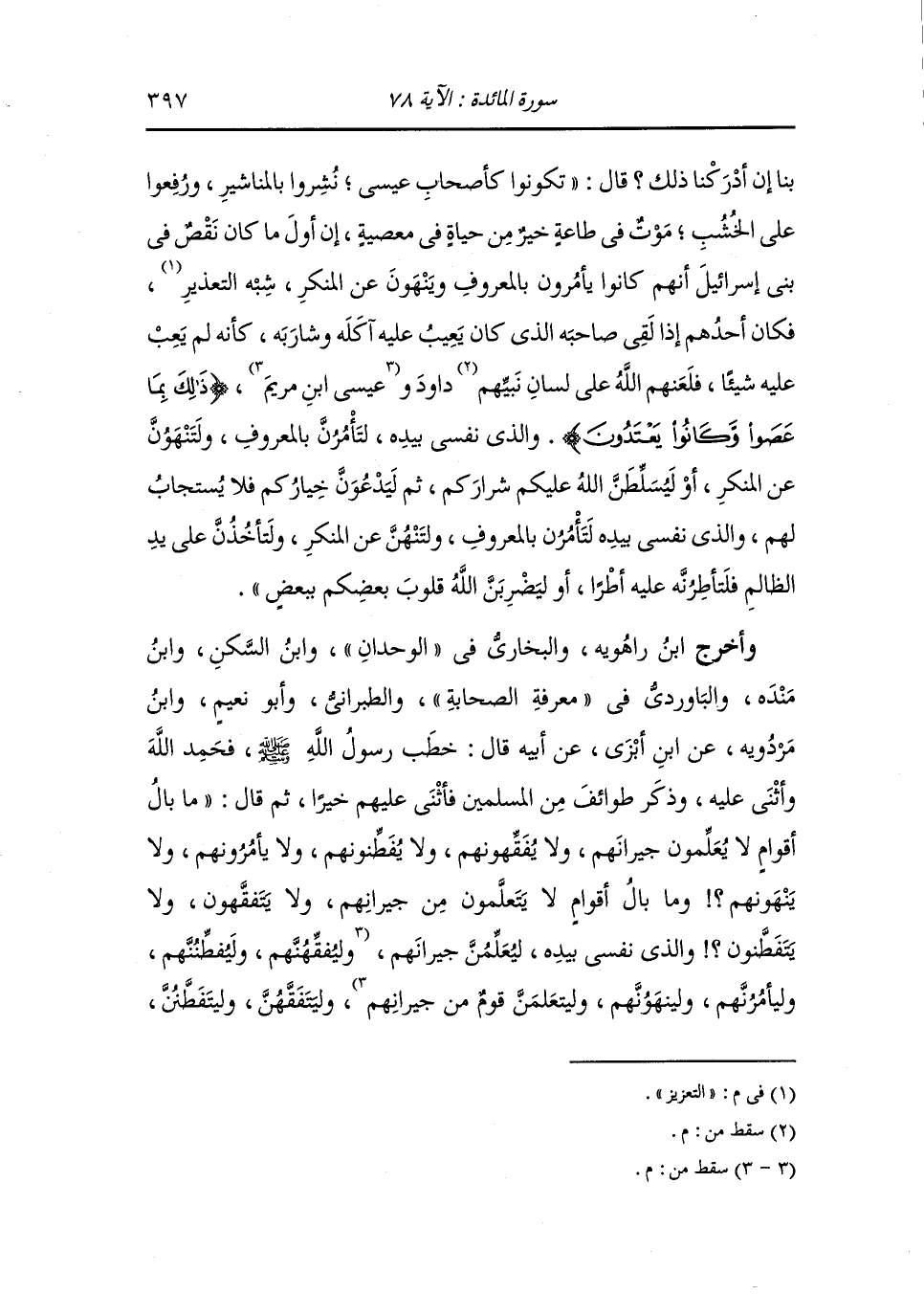 بنا ان أدركنا ذلك قال : تكونون كأصحاب عيسى نشروا بالمناشير ورفعوا على الخشب موت في طاعة خير من حياة في معصية ان أول ماكان نقص في بني اسرئيل انهم كانوا يأمرون بالمعروف وينهون عن المنكر شبه التعزير فكان أحدهم اذا لقي صاحبه الذي كان يعيب عليه آكله وشاربه كأنه لم يعب عليه شيئا فلعنهم الله على لسان داود وذلك بما عصوا وكانوا يعتدون والذي نفسي بيده لتأمرن بالمعروف ولتنهون عن المنكر أو ليسلطن الله عليكم شراركم ثم ليدعون خياركم فلا يستجاب لكم والذي نفسي بيده لتأمرن بالمعروف ولتنهن عن المنكر ولتأخذن على يد الظالم فلتاطرنه عليه اطرا أو ليضربن الله قلوب بعضكم ببعض.