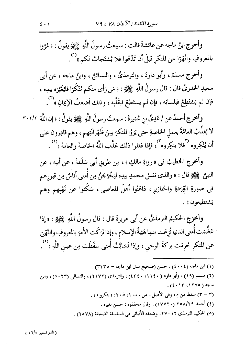 وأخرج الطبراني عن أبي موسى الأشعري عن النَّبِيّ صلى الله عليه وسلم قال ان من كان قبلكم من بني اسرائيل اذا عمل العامل فيهم الخطيئة فنهاه الناهي تعزيرا فاذا كان من الغد جالسه وآكله وشاربه كانه لم يره على خطيئة بالأمس فلما رأى الله ذلك منهم ضرب بقلوب بعضهم على بعض ولعنهم على لسان داود وعيسى بن مريم {ذلك بما عصوا وكانوا يعتدون} والذي نفس محمد بيده لتأمرن بالمعروف ولتنهن عن المنكر ولتأخذن على يد المسيء ولتأطرنه على الحق اطرا أو ليضربن الله بقلوب بعضكم على بعض ويلعنكم كما لعنهم.