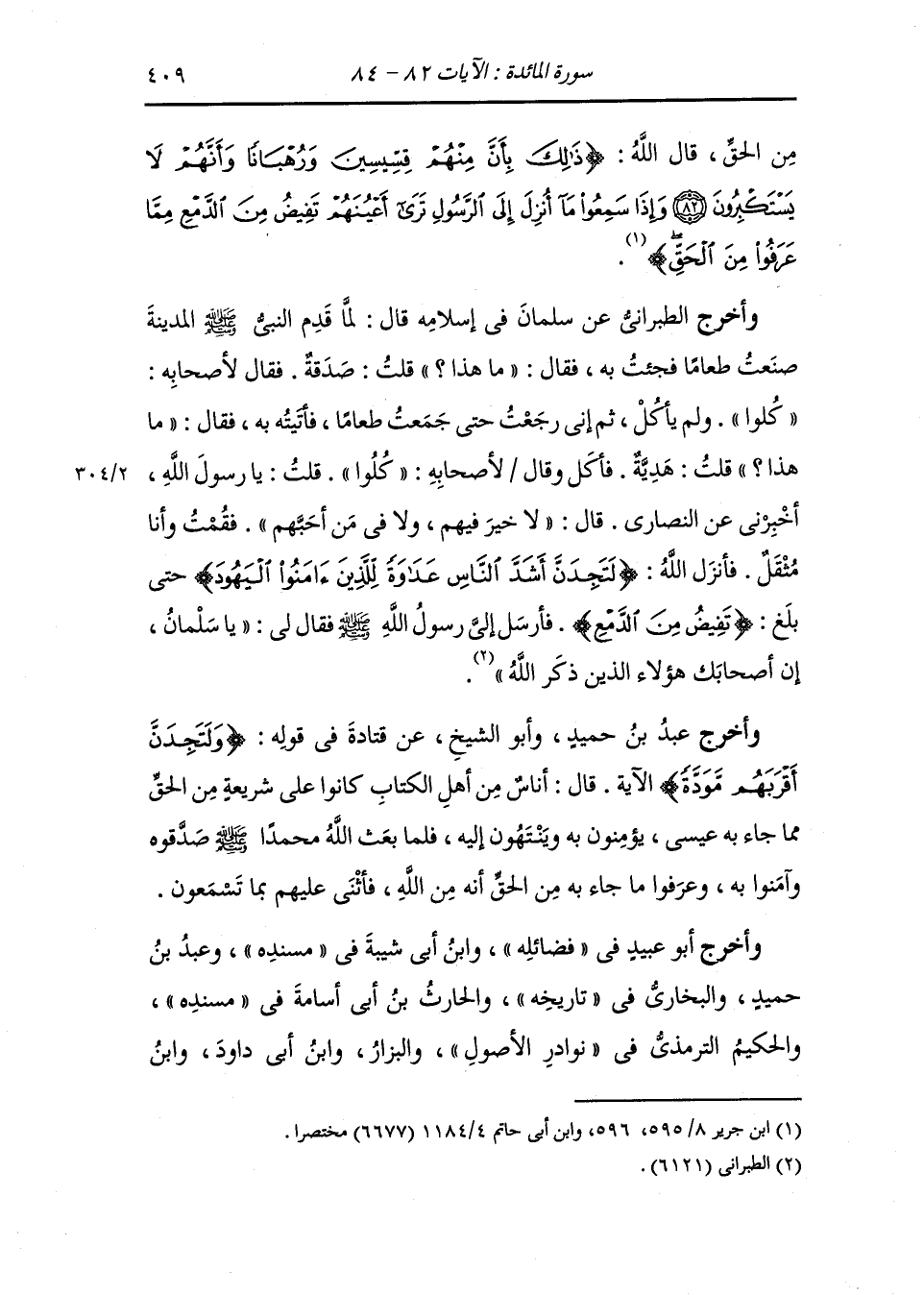 الأنباري في المصاحف ، وَابن المنذر ، وَابن أبي حاتم والطبراني ، وَابن مردويه عن سلمان أنه سئل عن قوله {ذلك بأن منهم قسيسين ورهبانا} قال : الرهبان الذين في الصوامع نزلت على رسول الله صلى الله عليه وسلم {ذلك بأن منهم قسيسين ورهبانا} ولفظ البزار دع القسيسين أقرأني رسول الله صلى الله عليه وسلم / {ذلك بأن منهم صديقين > / ولفظ الحكيم الترمذي : قرأت على النَّبِيّ صلى الله عليه وسلم {ذلك بأن منهم قسيسين} فأقرأني / {ذلك بأن منهم صديقين > /.
