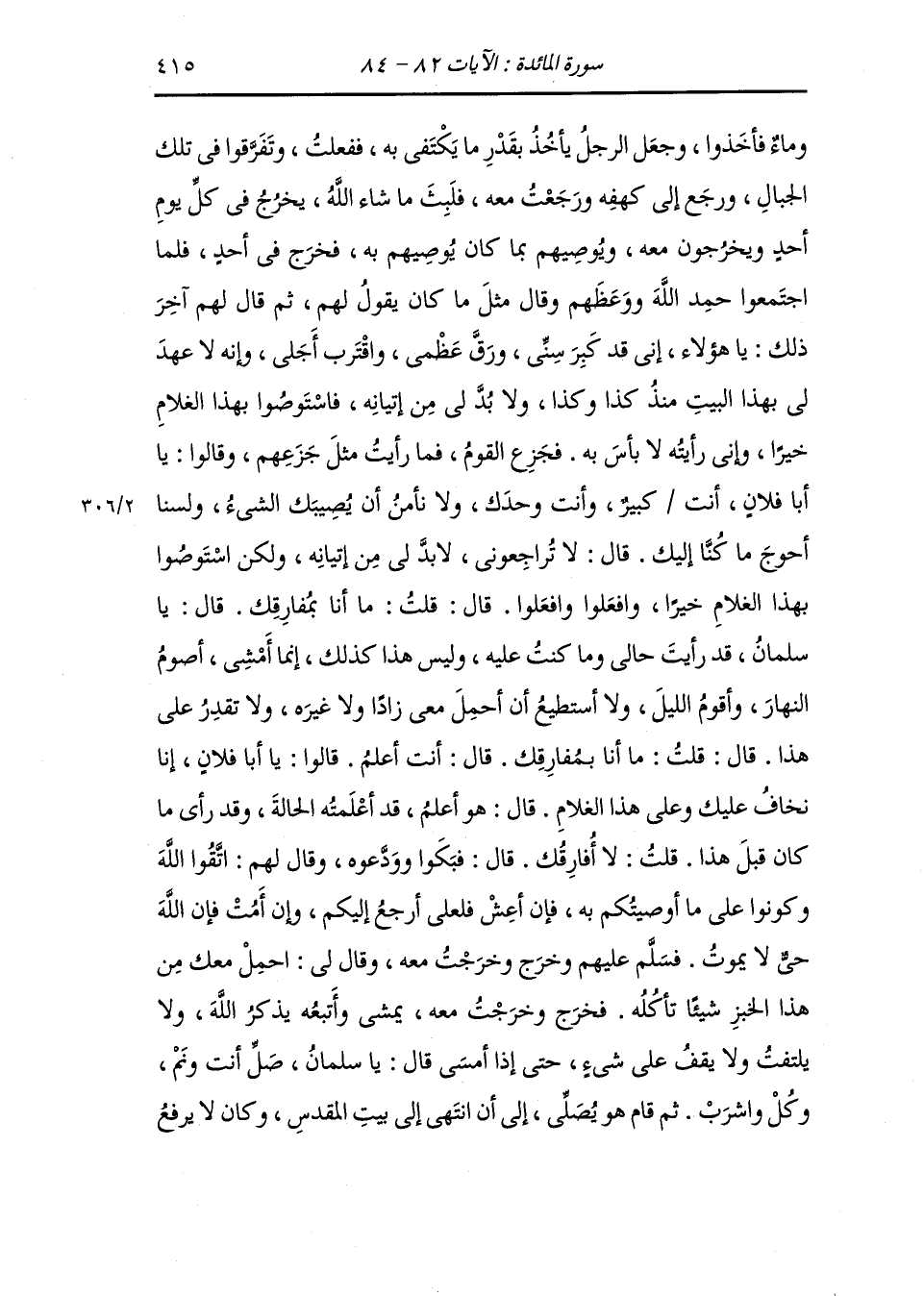 طرفه إلى السماء حتى انتهينا إلى بيت المقدس واذا على الباب مقعد قال : ياعبد الله قد ترى حالي فتصدق علي بشيء فلم يلتفت إليه ودخل المسجد ودخلت معه فجعل يتتبع أمكنة من المسجد يصلي فيها ثم قال : ياسلمان إني لم أنم منذ كذا وكذا ولم أجد طعم نوم فان انت جعلت لي أن توقظني اذا بلغ الظل مكان كذا وكذا نمت فاني أحب أن أنام في هذا المسجد