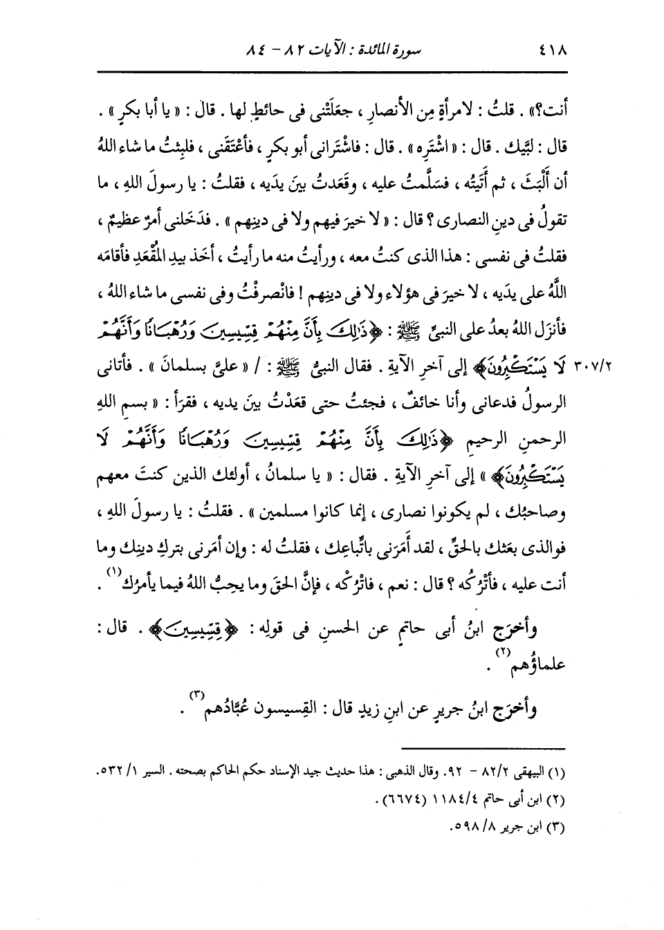 وأخرج ابن جرير عن ابن إسحاق قال : سألت الزهري عن هذه الآية {ذلك بأن منهم قسيسين ورهبانا وأنهم لا يستكبرون} وقوله {وإذا خاطبهم الجاهلون قالوا سلاما} الفرقان الآية 63 قال : مازلت أسمع علمائنا يقولون : نزلت في النجاشي وأصحابه.
