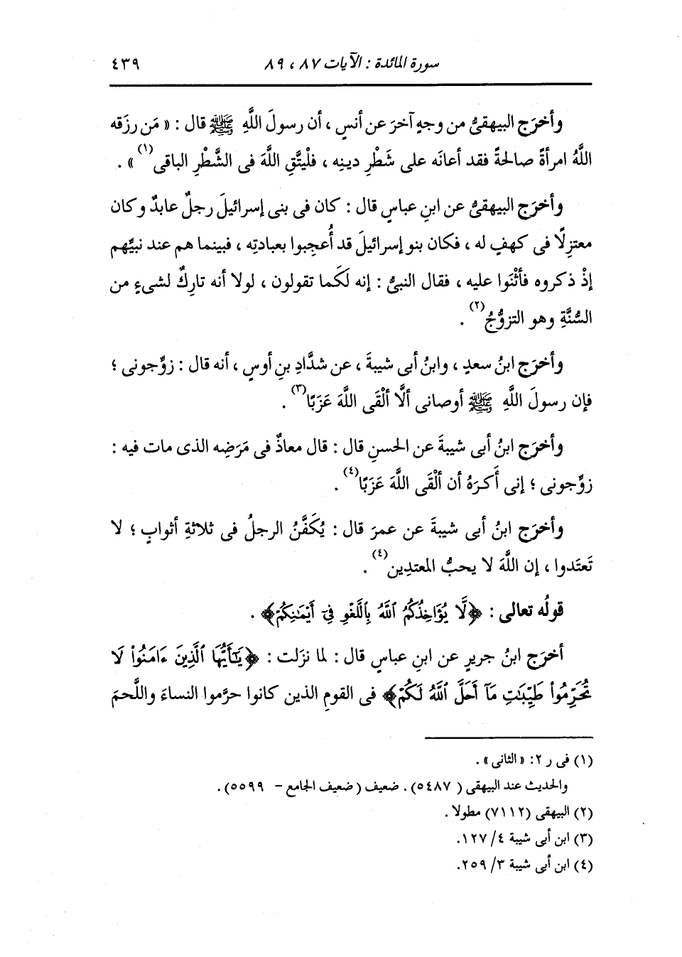 وأخرج عَبد بن حُمَيد عن سعيد بن جبير {لا يؤاخذكم الله باللغو في أيمانكم} قال : هو الرجل يحلف على الحلال أن يحرمه فقال الله {لا يؤاخذكم الله باللغو في أيمانكم} أن تتركه وتكفرعن يمينك {ولكن يؤاخذكم بما عقدتم الأيمان} قال : ما أقمت عليه.