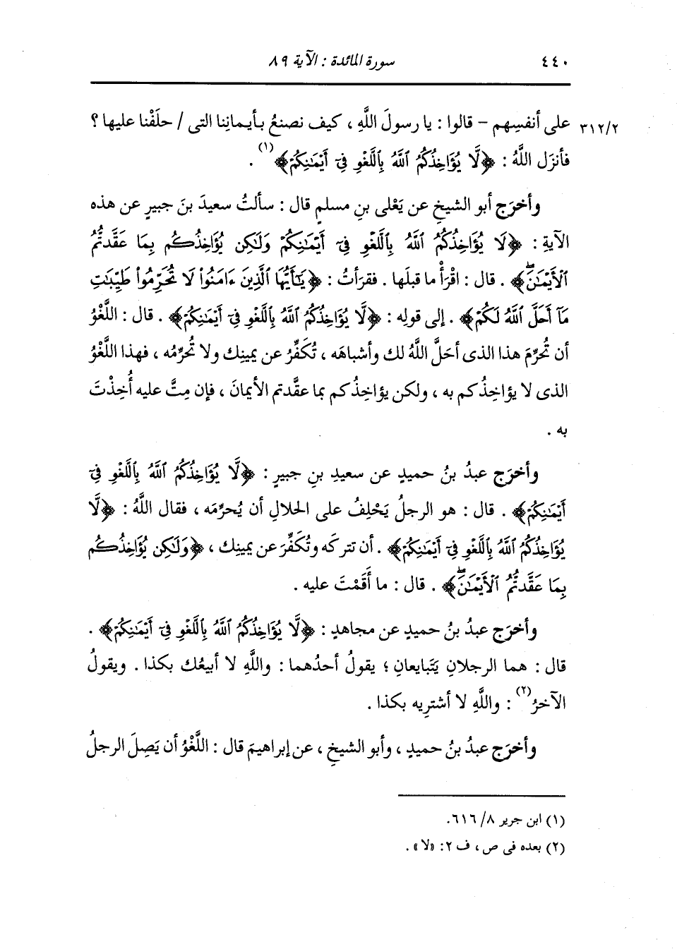 وأخرج عَبد بن حُمَيد عن أبي مالك قال : الأيمان ثلاثة ، يمين تكفر ويمين لا تكفر ويمين لا يؤاخذ بها فاما التي تكفر فالرجل يحلف على قطيعة رحم أو معصية الله فيكفر يمينه والتي لا تكفر الرجل يحلف على الكذب متعمدا ولا تكفر والتي لا يؤاخذ بها فالرجل يحلف على الشيء يرى أنه صادق فهو اللغو لا يؤاخذ به ، والله أعلم.