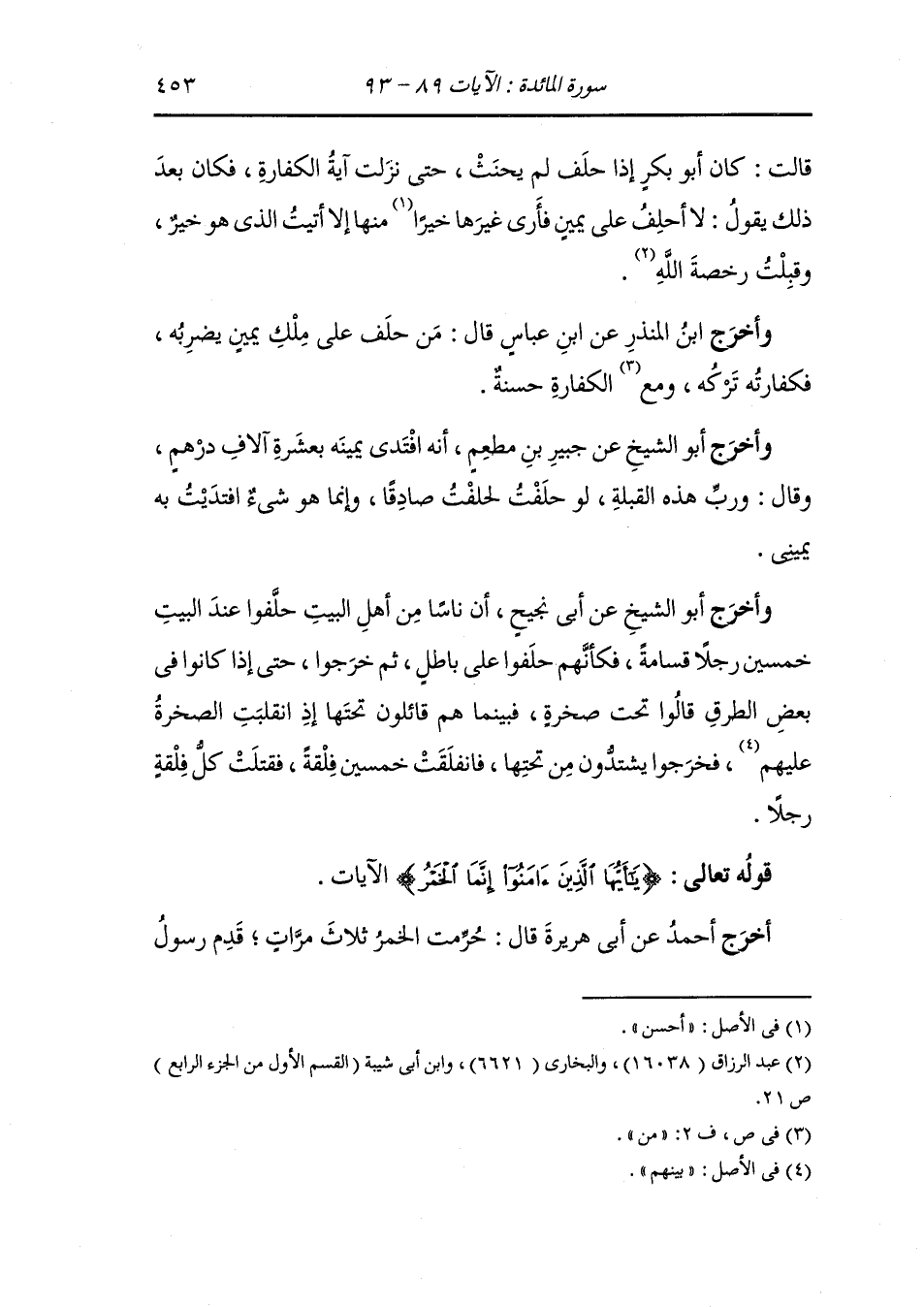 الله صلى الله عليه وسلم وهم يشربون الخمر ويأكلون الميسر فسألوا رسول الله صلى الله عليه وسلم عنهما فأنزل الله {يسألونك عن الخمر والميسر} البقرة الآية 219 الآية ، فقال الناس ما حرم علينا إنما قال إثم كبير وكانوا يشربون الخمر حتى كان يوم من الأيام صلى رجل من المهاجرين أم أصحابه في المغرب خلط في قراءته فأنزل الله أغلظ منها {يا أيها الذين آمنوا لا تقربوا الصلاة وأنتم سكارى حتى تعلموا ما تقولون} النساء الآية 43 وكان الناس يشربون حتى يأتي أحدهم الصلاة وهو مغتبق ثم نزلت آية أغلظ من ذلك {يا أيها الذين آمنوا إنما الخمر} إلى قوله {فهل أنتم منتهون} قالوا : انتهينا ربنا فقال الناس : يا رسول الله ناس قتلوا في سبيل الله وماتوا على فرشهم كانوا يشربون الخمر ويأكلون الميسر وقد جعله الله رجسا من عمل الشيطان فأنزل الله {ليس على الذين آمنوا وعملوا الصالحات جناح} إلى آخر الآية ، وقال النَّبِيّ صلى الله عليه وسلم : لو حرم عليهم لتركوه كما تركتم.