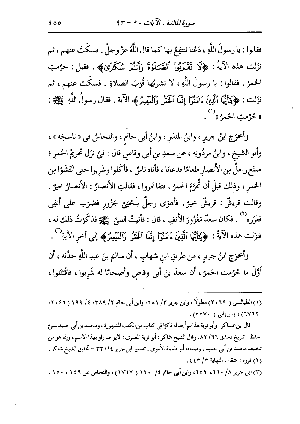 وأخرج عَبد بن حُمَيد والنسائي ، وَابن جَرِير ، وَابن المنذر وأبو الشيخ والحاكم وصححه ، وَابن مردويه والبيهقي عن ابن عباس قال : إنما نزل تحريم الخمر في قبيلتين من قبائل الأنصار شربوا فلما أن ثمل القوم عبث بعضهم ببعض فلما أن صحوا جعل يرى الرجل منهم الأثر بوجهه وبرأسه ولحيته فيقول : صنع بي هذا أخي فلان وكانوا إخوة ليس في