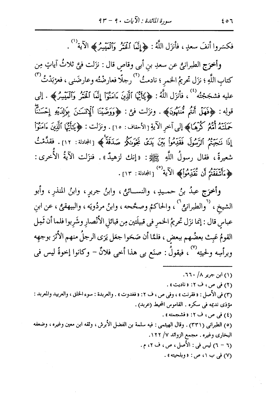 بي هذا حتى وقعت الضغائن في قلوبهم فأنزل الله هذه الآية {يا أيها الذين آمنوا إنما الخمر والميسر} إلى قوله {فهل أنتم منتهون} فقال ناس من المتكلفين : هي رجس وهي في بطن فلان قتل يوم بدر وفلان قتل يوم أحد فأنزل الله هذه الآية {ليس على الذين آمنوا وعملوا الصالحات جناح فيما طعموا} الآية.