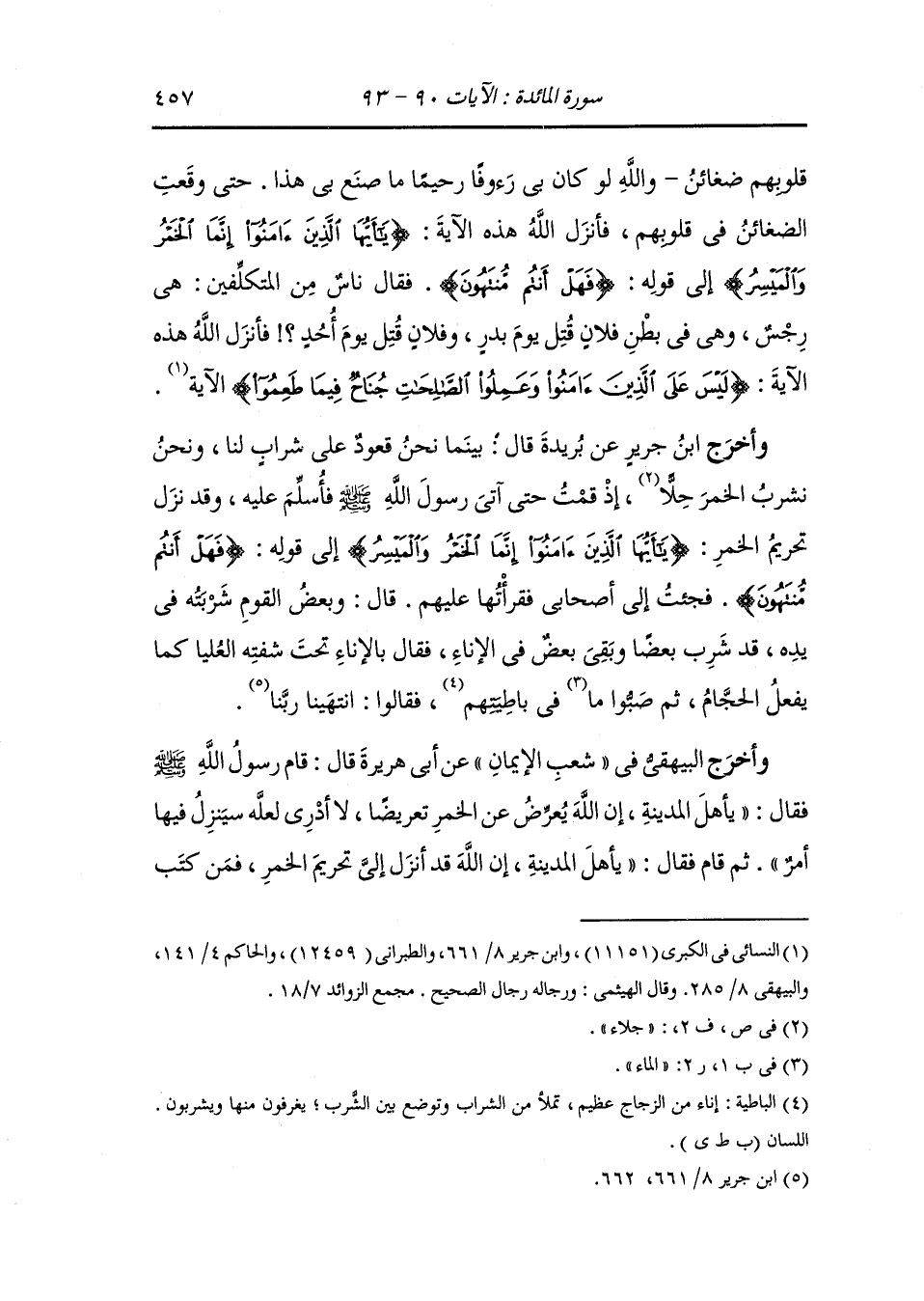 وأخرج ابن المنذر عن سعيد بن جبير قال لما نزلت في البقرة {يسألونك عن الخمر والميسر قل فيهما إثم كبير ومنافع للناس} البقرة الآية 219 شربها قوم لقوله منافع للناس وتركها قوم لقوله إثم كبير منهم عثمان بن مظعون حتى نزلت الآية التي في النساء {لا تقربوا الصلاة وأنتم سكارى} النساء الآية 43 فتركها قوم وشربها قوم يتركونها بالنهار حين الصلاة ويشربونها بالليل حتى نزلت الآية التي في المائدة {إنما الخمر والميسر}