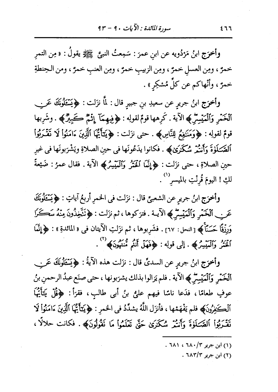 يشربونها من صلاة الغداة حتى يرتفع النهار فيقومون إلى صلاة الظهر وهم مصحون ثم لا يشربونها حتى يصلوا العتمة ثم يقومون إلى صلاة الفجر وقد صحوا فلم يزالوا بذلك يشربونها حتى صنع سعد بن أبي وقاص طعاما فدعا ساقيهم رجل من الأنصار فشوى لهم رأس بعير ثم دعاهم عليه فلما أكلوا وشربوا من الخمر سكروا وأخذوا في الحديث فتكلم سعد بشيء فغضب الأنصاري فرفع لحي البعير فكسر أنف سعد فأنزل الله نسخ الخمر وتحريمها {إنما الخمر والميسر} إلى قوله {فهل أنتم منتهون}.