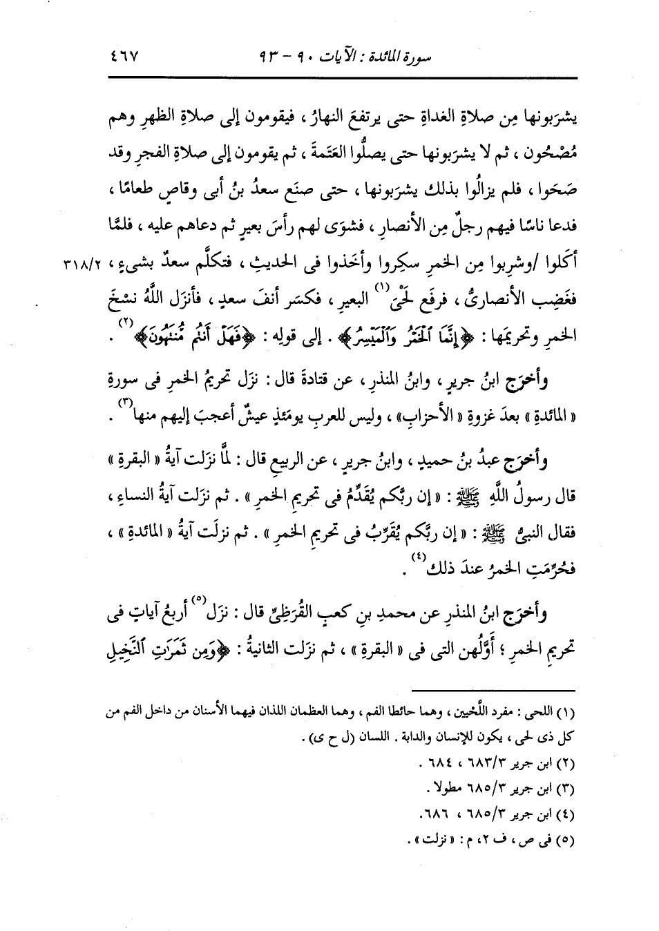 والأعناب تتخذون منه سكرا ورزقا حسنا} النحل الآية 67 ثم أنزلت التي في النساء بينا رسول الله صلى الله عليه وسلم يصلي بعض الصلوات إذ غنى سكران خلفه فأنزل الله {لا تقربوا الصلاة وأنتم سكارى} النساء الآية 43 الآية ، فشربها طائفة من الناس وتركها طائفة ثم نزلت الرابعة التي في المائدة فقال عمر ين الخطاب انتهينا ياربنا.