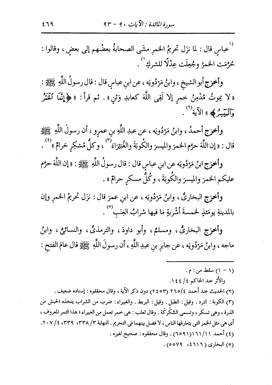 وأخرج ابن مردويه عن ابن عباس قال قدم رجل من دوس على النَّبِيّ صلى الله عليه وسلم براوية من خمر أهداها له فقال النَّبِيّ صلى الله عليه وسلم : هل علمت أن الله حرمها بعدك فأقبل الدوسي على رجل كان معه فأمره ببيعها فقال له رسول الله صلى الله عليه وسلم : هل علمت أن الذي حرم شربها حرم بيعها وأكل ثمنها وأمر بالمزاد فأهريقت حتى لم يبق فيها قطرة.