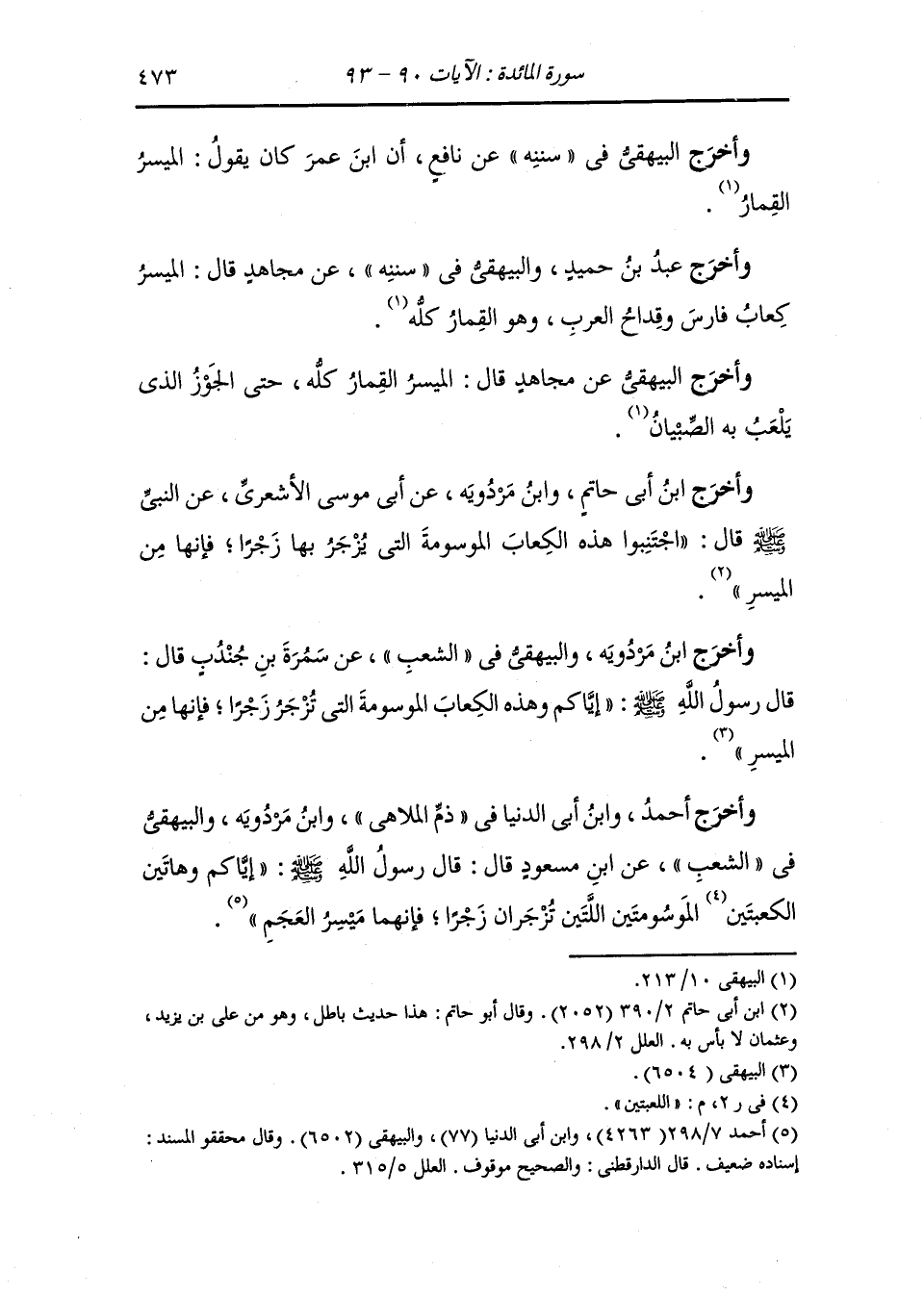 وأخرج وكيع وعبد الرزاق ، وَابن أبي شيبة ، وعَبد بن حُمَيد ، وَابن أبي الدنيا ، وَابن جَرِير ، وَابن المنذر ، وَابن أبي حاتم والطبراني وأبوالشيخ عن ابن مسعود قال : إياكم وهذه الكعاب الموسومة التي تزجر زجرا فإنها ميسر العجم.
