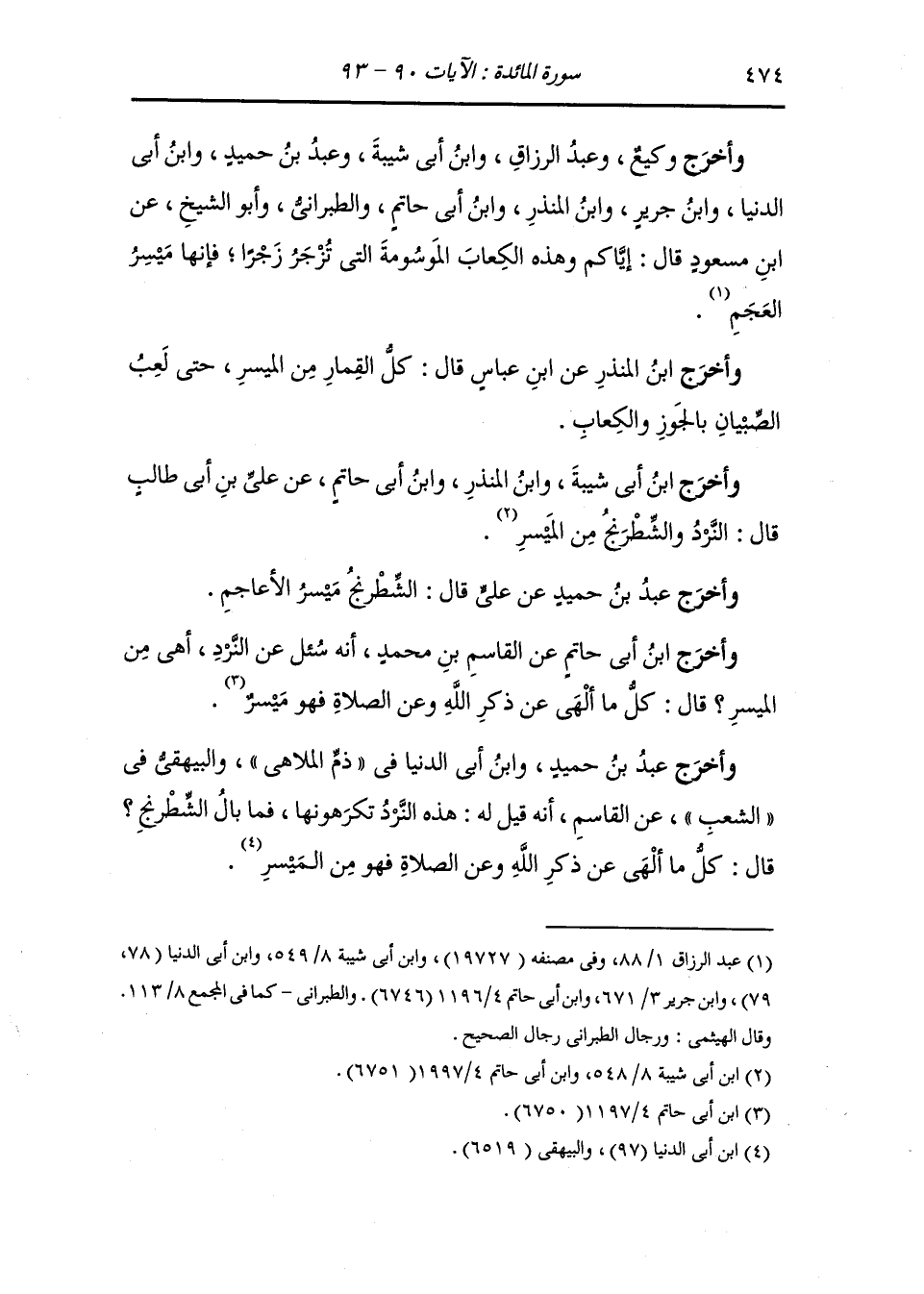 الشعب من طريق ربيعة بن كلثوم عن أبيه قال : خطبنا ابن الزبير فقال : يا أهل مكة بلغني عن رجال يلعبون بلعبة يقال لها النرد شير وإن الله يقول في كتابه {يا أيها الذين آمنوا إنما الخمر والميسر} إلى قوله {فهل أنتم منتهون} وإني أحلف بالله لا أوتى بأحد لعب بها إلا عاقبته في شعره وبشره وأعطيت سلبه من أتاني به.