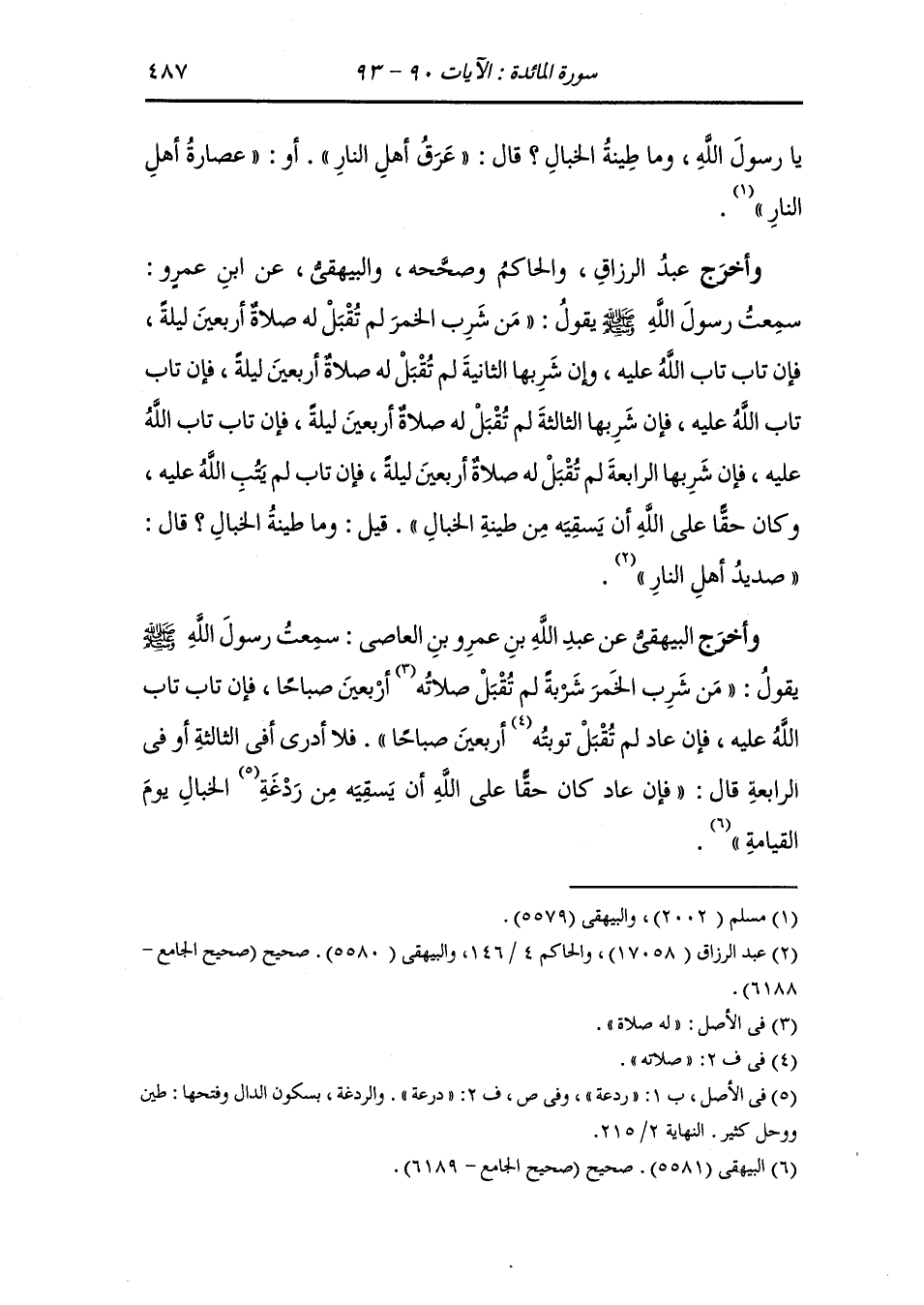 وأخرج الحاكم وصححه والبيهقي عن عبد الله بن عمر وعن رسول الله صلى الله عليه وسلم قال من ترك الصلاة سكرا مرة واحدة فكأنما كانت له الدنيا وما عليها فسلبها ومن ترك الصلاة سكرا أربع مرات كان حقا على الله أن يسقيه من طينة الخبال ، قيل : وما طينة الخبال يا رسول الله قال : عصارة أهل النار.