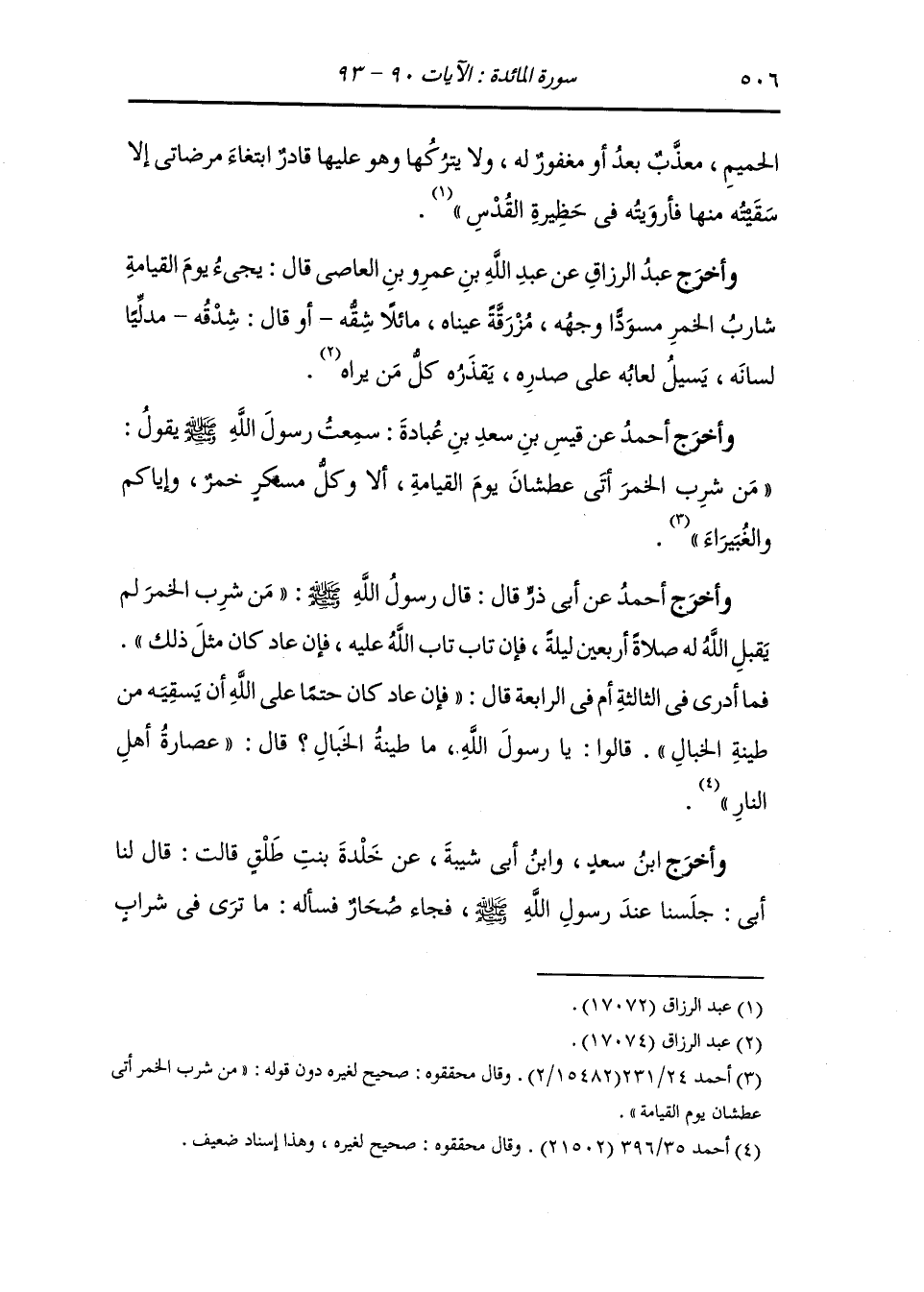 وأخرج أحمد عن أسماء بنت يزيد ، أنها سمعت رسول الله صلى الله عليه وسلم يقول من شرب الخمر لم يرض الله عنه أربعين ليلة فإن مات مات كافرا وإن تاب تاب الله عليه وإن عاد كان حقا على الله أن يسقيه من طينة الخبال ، قلت : يا رسول الله وما طينة الخبال قال : صديد أهل النار.