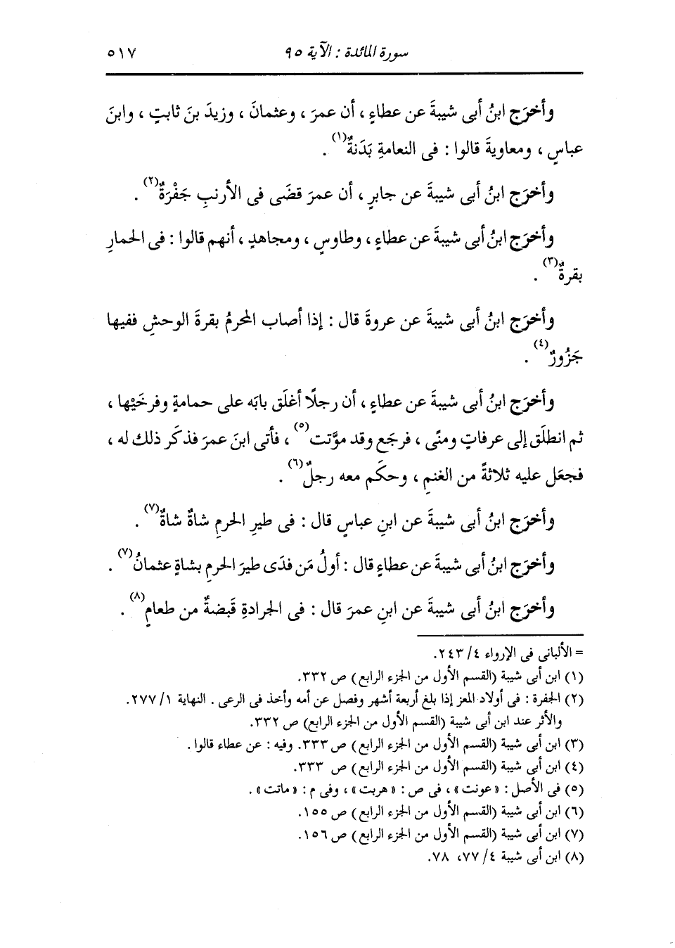 وأخرج ابن جرير عن إبراهيم النخعي قال : ما أصاب المحرم من شيء حكم فيه قيمته.