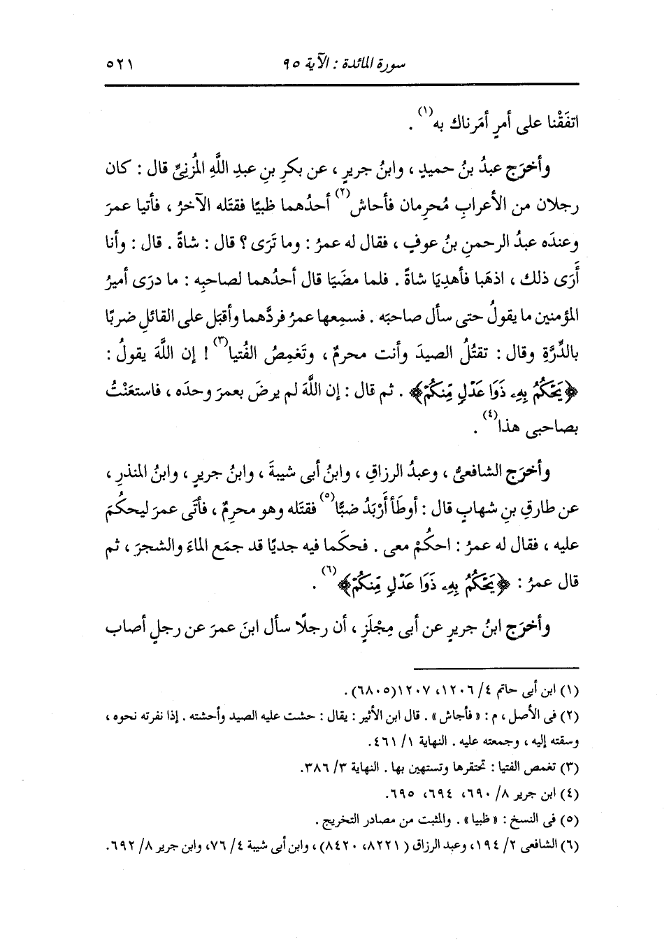 وأخرج ابن جرير عن عمرو بن حبشي قال : سمعت رجلا سأل عبد الله بن عمر عن رجل أصاب ولد أرنب فقال : فيه ولد ماعز فيما أرى أنا ثم قال لي : أكذاك فقلت : أنت أعلم مني ، فقال : قال الله {يحكم به ذوا عدل منكم}.