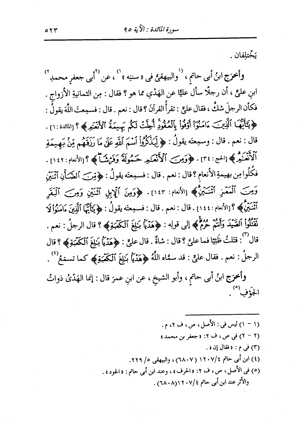 وأخرج ابن جرير ، وَابن المنذر عن ابن جريج قال : قال لي الحسن بن مسلم : من أصاب من الصيد ما يبلغ أن يكون فيه شاة فصاعدا فذلك الذي قال الله {فجزاء مثل ما قتل من النعم} وأما {كفارة طعام مساكين} فذلك الذي لا يبلغ أن يكون فيه هدي العصفور يقتل فلا يكون هدي قال {أو