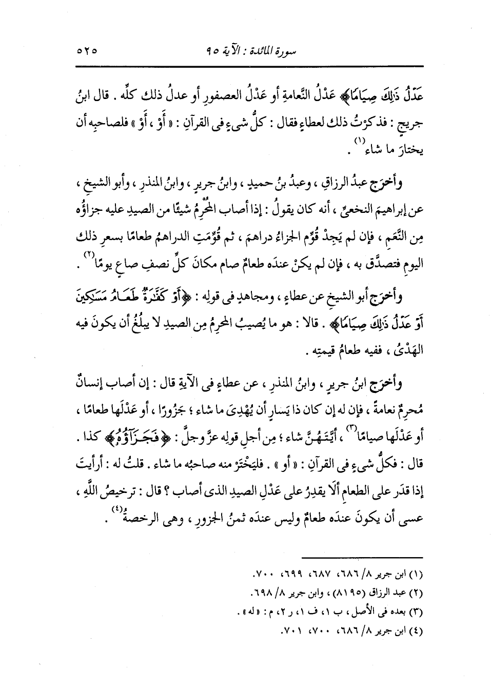 وأخرج ابن أبي حاتم عن عطاء الخراساني ، أن عمر بن الخطاب وعثمان بن عفان وعلي بن أبي طالب ، وَابن عباس وزيد بن ثابت ومعاوية قضوا فيما كان من هدي مما يقتل المحرم من صيد فيه جزاء نظر إلى قيمة ذلك فأطعم به المساكين.