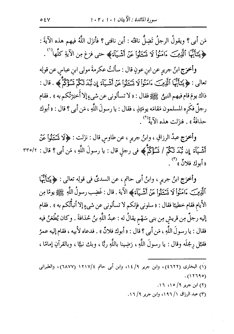 آبائي قال : في النار ، فقام آخر فقال : من أبي فقال : أبوك حذافة ، فقام عمر بن الخطاب فقال : رضينا بالله ربا وبالإسلام دينا وبمحمد نبيا وبالقرآن إماما إنا يا رسول الله حديث عهد بجاهلية وشرك والله أعلم من آباؤنا فسكن غضبه ونزلت هذه الآية {يا أيها الذين آمنوا لا تسألوا عن أشياء}.