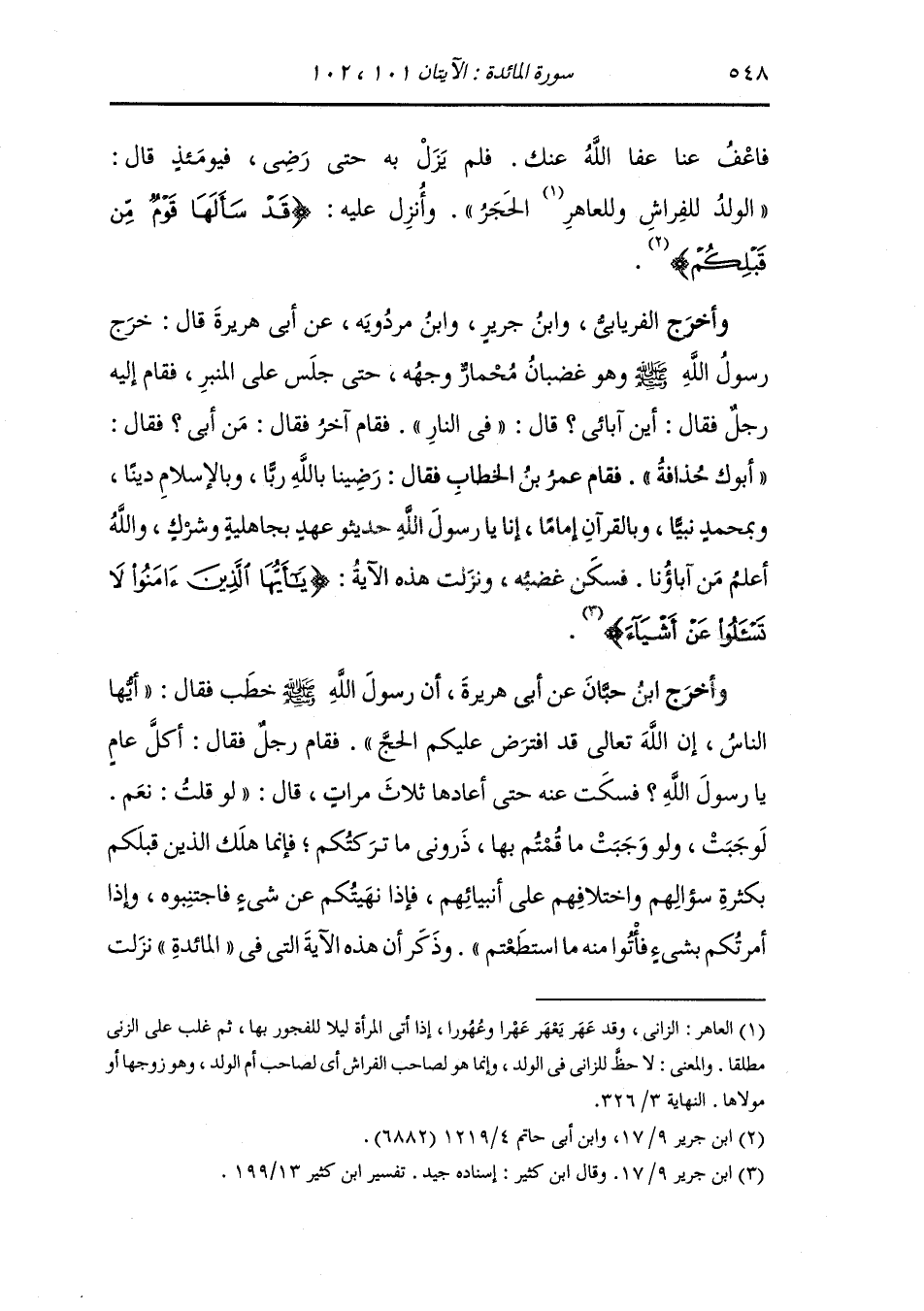 وأخرج ابن جرير وأبو الشيخ ، وَابن مردويه عن أبي هريرة قال : خطبنا رسول الله صلى الله عليه وسلم فقال يا أيها الناس كتب الله عليكم الحج ، فقام عكاشة بن محصن الأسدي فقال : أفي كل عام يارسول الله قال : أما أني لو قلت نعم لوجبت ولو وجبت ثم تركتكم لضللتم اسكتوا عني ما سكت عنكم فإنما هلك من كان قبلكم بسؤالهم واختلافهم على أنبيائهم فأنزل الله {يا أيها الذين آمنوا لا تسألوا عن أشياء إن تبد لكم تسؤكم} إلى آخر الآية.