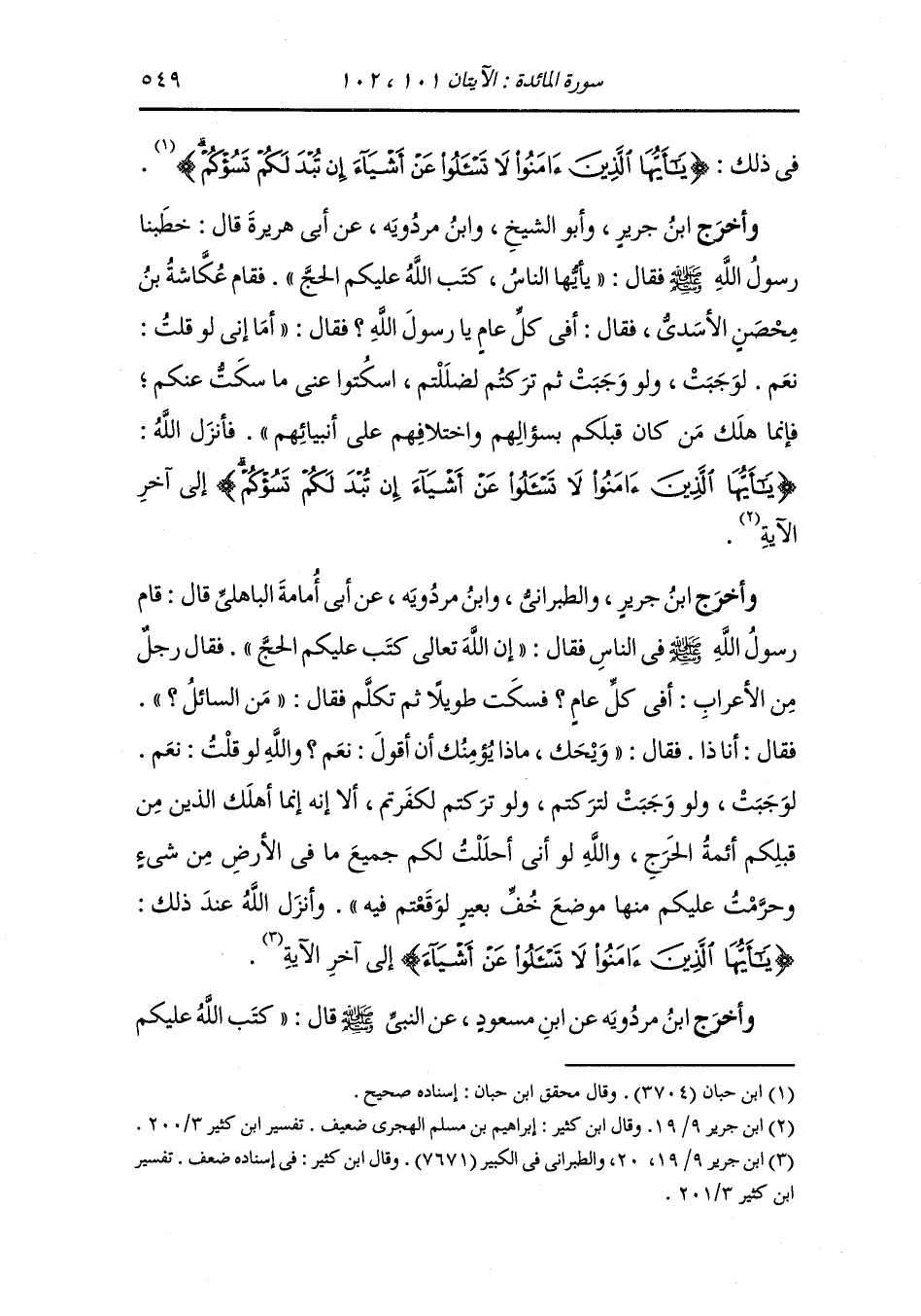 وأخرج ابن مردويه عن ابن عباس قال جاء رجل إلى النَّبِيّ صلى الله عليه وسلم فقال : أين أبي قال : في النار ، ثم جاء آخر فقال : يا رسول الله الحج كل عام فغضب رسول الله صلى الله عليه وسلم فحول وركه فدخل البيت ثم خرج فقال : لم تسألوني عما لا أسألكم عنه ثم قال : والذي نفسي بيده لو قلت نعم لوجبت عليكم كل عام ثم لكفرتم فأنزل الله {يا أيها الذين آمنوا لا تسألوا عن أشياء} الآية.