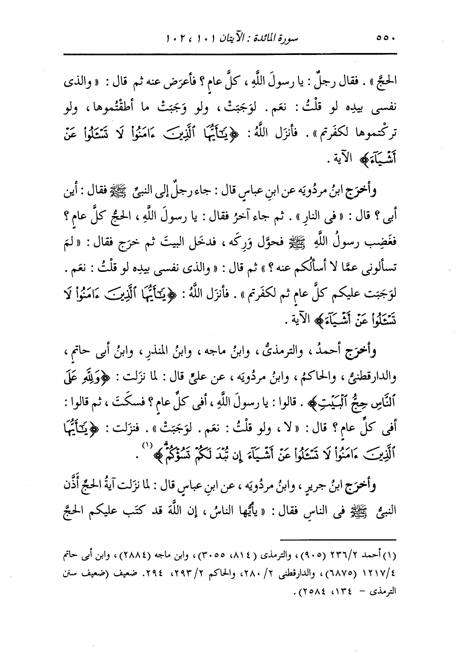وأخرج ابن جرير ، وَابن أبي حاتم ، وَابن مردويه عن ابن عباس أن رسول الله صلى الله عليه وسلم أذن في الناس فقال : يا قوم كتب عليكم الحج فقام رجل من بني أسد فقال : يا رسول الله أفي كل عام فغضب غضبا شديدا فقال : والذي نفسي بيده لو قلت نعم لوجبت ولو وجبت ما استطعتم وإذن لكفرتم فاتركوني ماتركتكم واذ أمرتكم بشيء فافعلوا وإذا نهيتكم عن شيء فانتهوا عنه فأنزل الله {لا تسألوا عن أشياء إن تبد لكم تسؤكم} نهاهم أن يسألوا عن مثل الذي سألت النصارى من المائدة فأصبحوا بها كافرين فنهى الله عن ذلك وقال {لا تسألوا عن أشياء} أي إن نزل القرآن فيها بتغليظ ساءكم ذلك ولكن انتظروا فإذا نزل القرآن فإنكم لا تسألون عن شيء إلا وجدتم تبيانه.