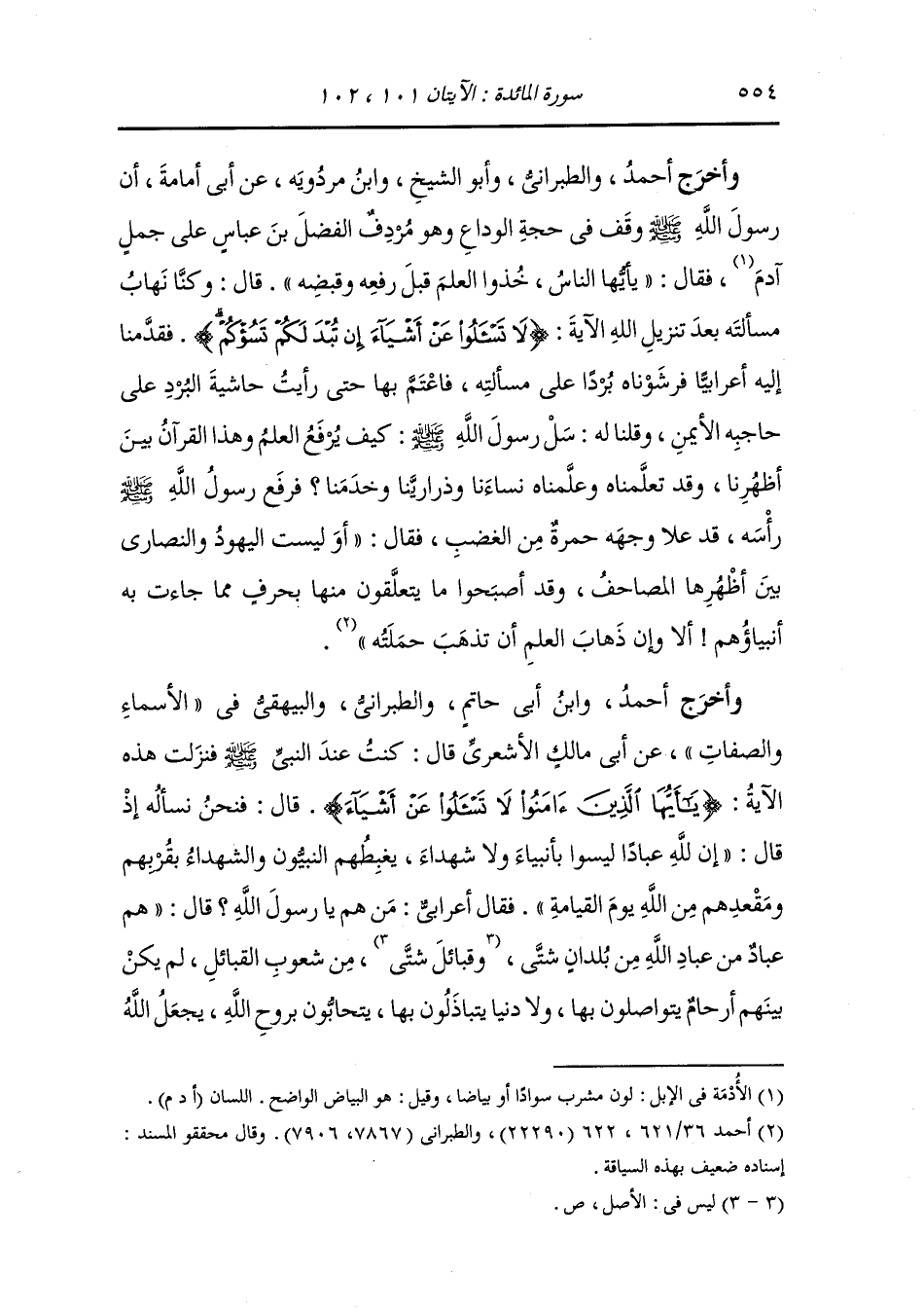 وأخرج محمد بن نصر المروزي في كتاب الصلاة والخرائطي في مكارم الأخلاق عن معاذ بن جبل قال كنا مع النَّبِيّ صلى الله عليه وسلم فتقدمت به راحلته ثم إن راحلتي لحقت براحلته حتى تصحب ركبتي ركبته فقلت : يا رسول الله إني أريد أن أسألك عن أمر يمنعني مكان هذه الآية {يا أيها الذين آمنوا لا تسألوا عن أشياء إن تبد لكم تسؤكم} قال : ما هو
