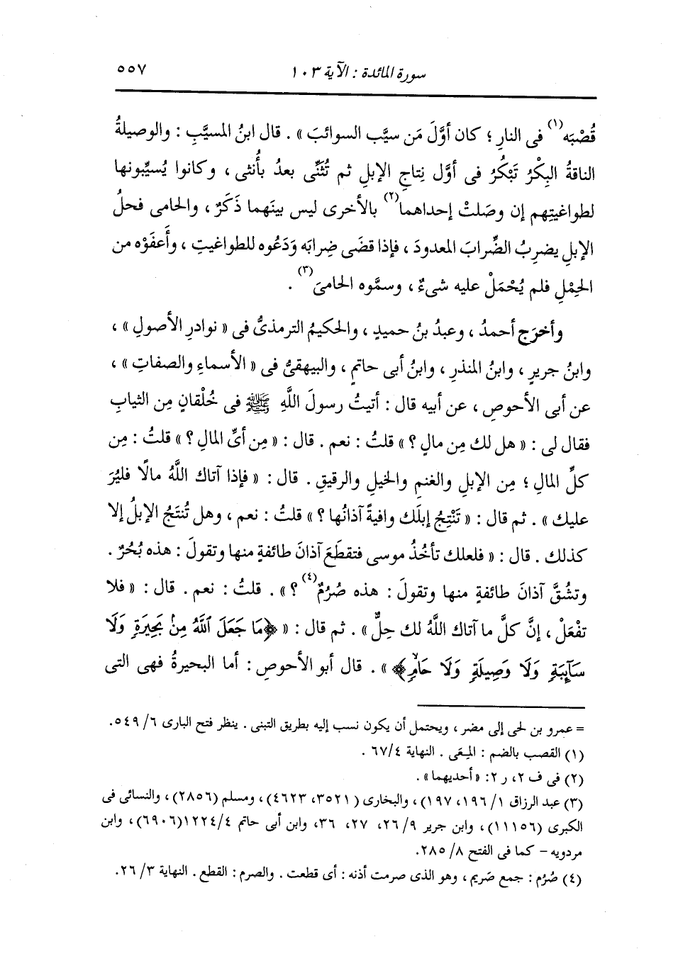 وأخرج ابن جرير ، وَابن المنذر ، وَابن أبي حاتم من طريق علي بن أبي طلحة عن ابن عباس قال : البحيرة ، هي الناقة إذا أنتجت خمسة أبطن نظروا إلى الخامس فإن كان ذكرا ذبحوه فأكله الرجال دون النساء وإن كانت أنثى جدعوا آذانها فقالوا : هذه بحيرة.