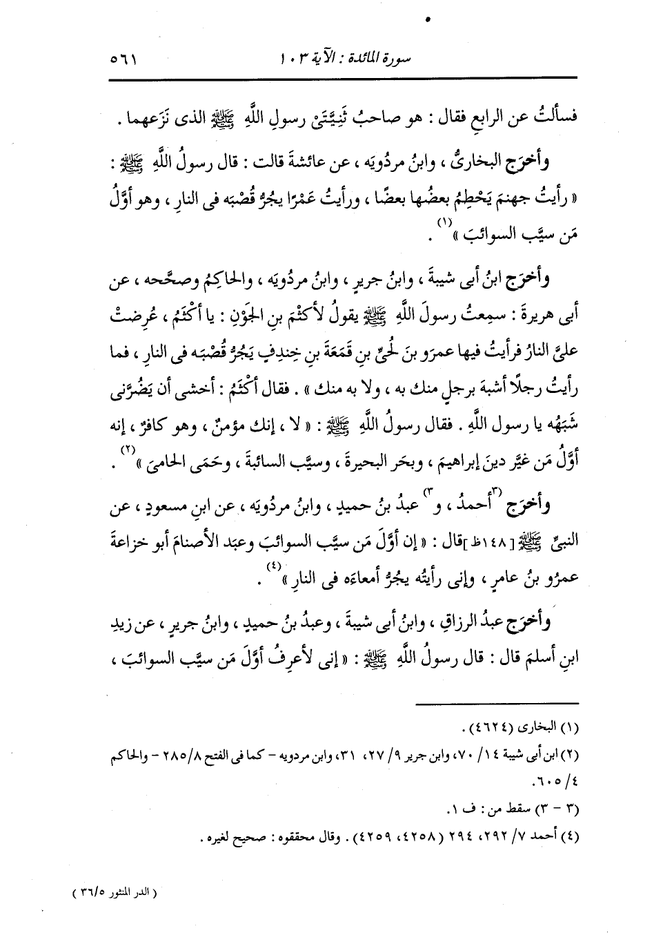 ونصب النصب وأول من غير دين إبراهيم قالوا : من هو يا رسول الله قال : عمرو بن لحي أخو بني كعب لقد رأيته يجر قصبه في النار يؤذي أهل النار ريح قصبه وإني لأعرف من بحر البحائر ، قالوا : من هو يا رسول الله قال : رجل من بني مدلج كانت له ناقتان فجدع آذانهما وحرم البانهما وظهورهما وقال : هاتان لله ثم احتاج إليهما فشرب البانهما وركب ظهورهما قال : فلقد رأيته في النار وهما يقضمانه بأفواههما ويطآنه باخفافهما.