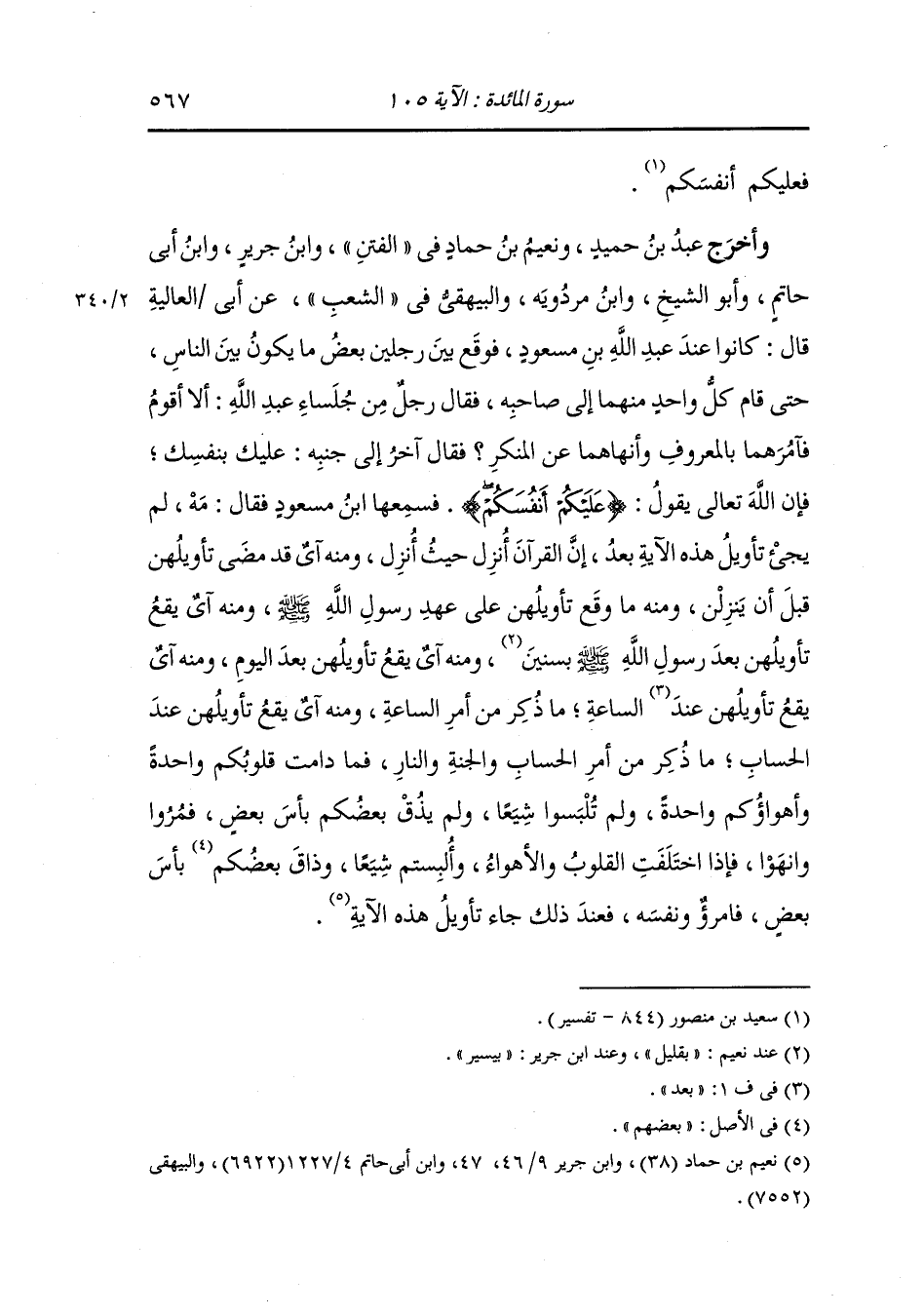 وأخرج عَبد بن حُمَيد ، وَابن جَرِير وأبو الشيخ من طريق قتادة عن أبي مازن قال : انطلقت على عهد عثمان إلى المدينة فإذا قوم جلوس فقرأ أحدهم {عليكم أنفسكم} فقال : أكثرهم : لم يجيء تأويل هذه الآية اليوم.