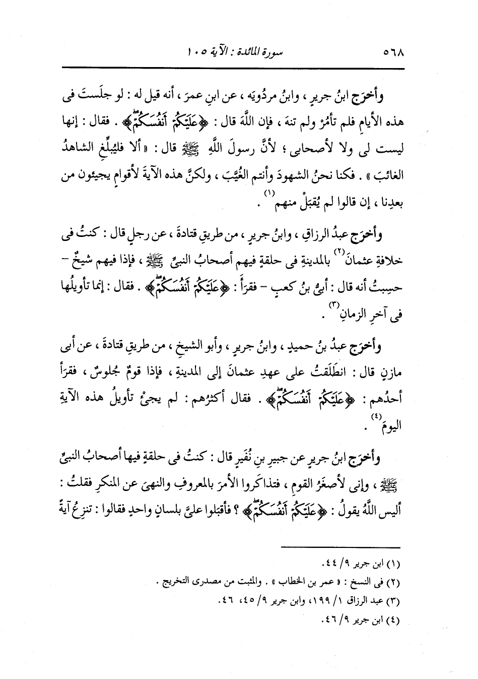 وأخرج ابن مردويه عن أبي سعيد الخدري قال : ذكرت هذه الآية عند رسول الله صلى الله عليه وسلم ، قول الله عز وجل {يا أيها الذين آمنوا عليكم أنفسكم لا يضركم من ضل إذا اهتديتم} فقال نبي الله صلى الله عليه وسلم : لم يجى ء تأويلها لا يجيء تأويلها حتى يهبط عيسى بن مريم عليه السلام