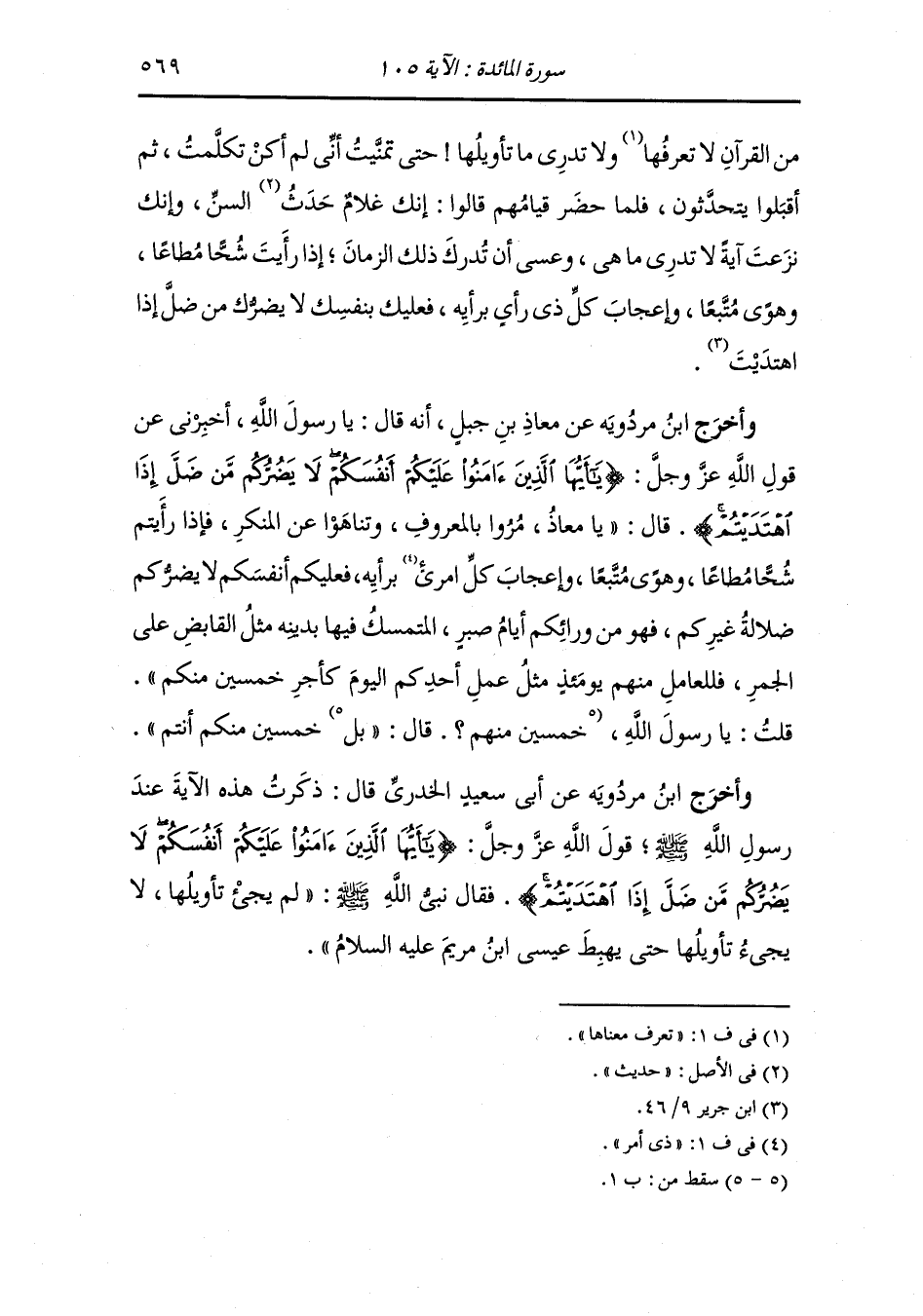 رسول الله صلى الله عليه وسلم يقول : ما ترك قوم الجهاد في سبيل الله إلا ضربهم الله بذل ولا أقر قوم المنكر بين أظهارهم إلا عمهم الله بعقاب وما بينك وبين أن يعمكم الله بعقاب من عنده إلا أن تأولوا هذه الآية على غير أمر بمعروف ولا نهي عن المنكر {يا أيها الذين آمنوا عليكم أنفسكم لا يضركم من ضل إذا اهتديتم}.