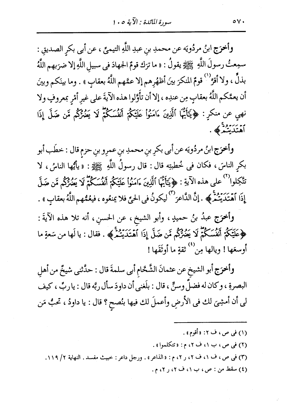 وأخرج ابن مردويه عن ابن عمر ، أنه جاء رجل فقال : يا أبا عبد الرحمن نفر ستة كلهم قرأ القرآن وكلهم مجتهد لا يألوهم في ذلك يشهد بعضهم على بعض بالشرك فقال : لعلك ترى أني آمرك أن تذهب إليهم تقاتلهم عظهم وانههم فإن عصوك فعليك نفسك فإن الله تعالى يقول {يا أيها الذين آمنوا عليكم أنفسكم} حتى ختم الآية.