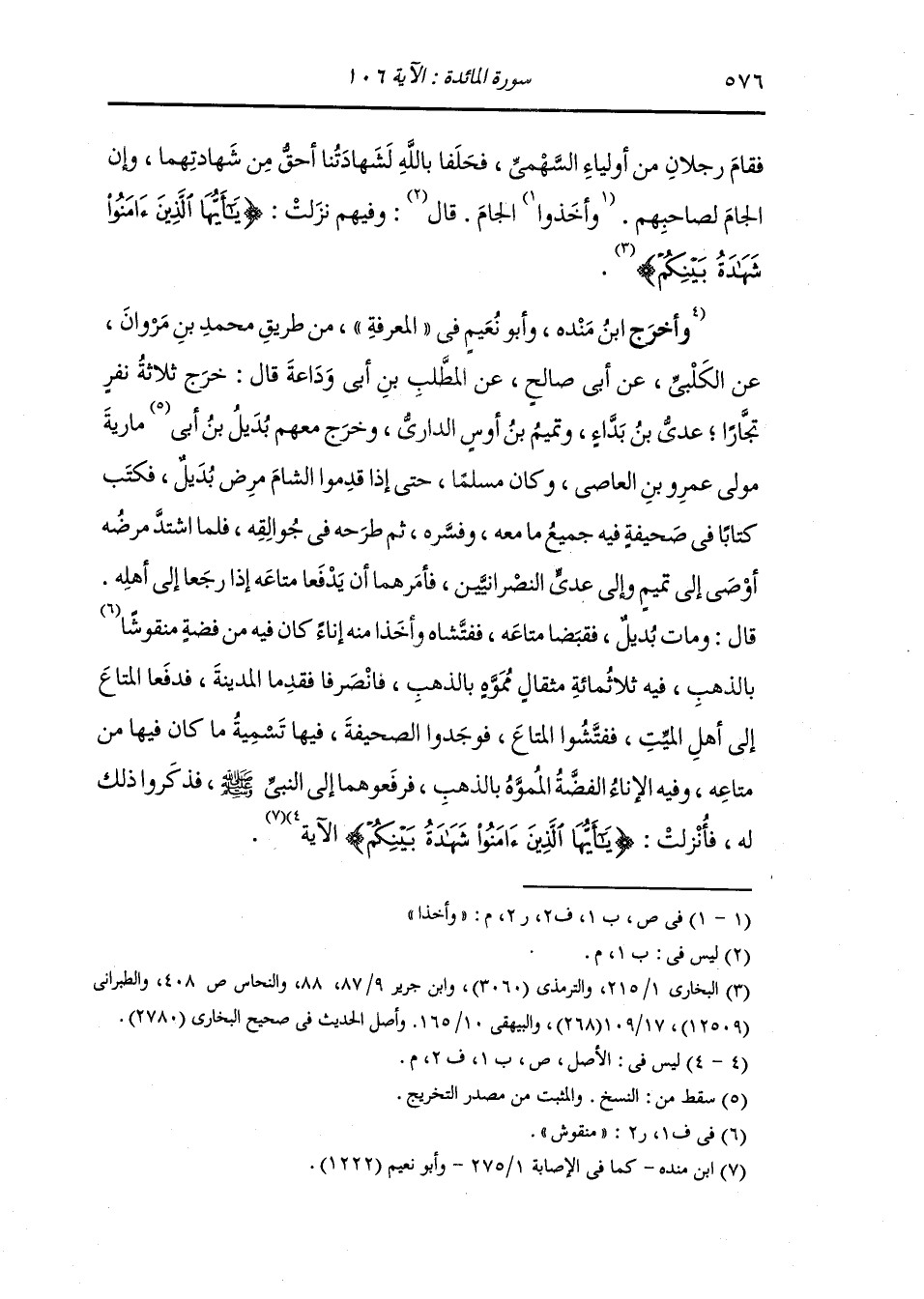 وأخرج ابن جرير ، وَابن المنذر عن عكرمة قال كان تميم الداري وعدي بن بداء رجلين نصرانيين يتجران إلى مكة في الجاهلية ويطيلان الإقامة بها فلما هاجر النَّبِيّ صلى الله عليه وسلم حول متجرهما إلى المدينة فخرج بديل بن أبي مارية مولى عمرو بن العاص تاجرا حتى قدم المدينة فخرجوا جميعا تجارا إلى الشام حتى إذا كانوا ببعض الطريق اشتكى بديل فكتب وصيته بيده ثم دسها في متاعه وأوصى إليهما فلما مات فتحا متاعه فأخذا منه شيئا ثم حجزاه كما كان وقدما المدينة على أهله فدفعا متاعه ففتح أهله متاعه فوجدوا كتابه وعهده وما خرج به وفقدوا شيئا فسألوهما عنه فقالوا : هذا الذي قبضنا له ودفع إلينا فقالوا لهما : هذا كتابه بيده قالوا :