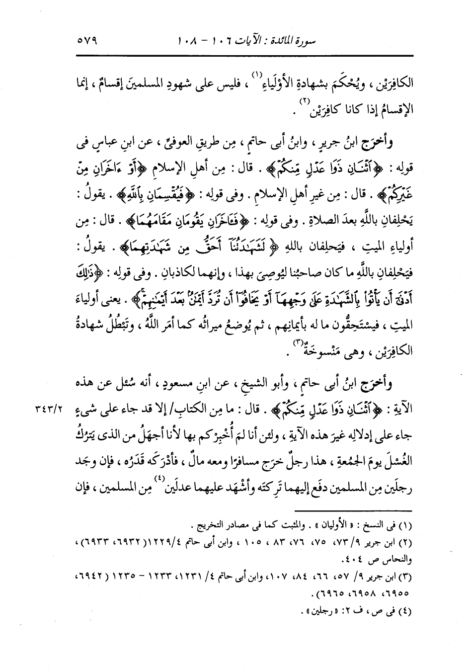 وأخرج عَبد بن حُمَيد وأبو الشيخ عن مجاهد {شهادة بينكم إذا حضر أحدكم الموت} قال : أن يموت المؤمن فيحضر موته مسلمان أو كافران لا يحضره غير اثنين منهم فإن رضي ورثته بما غابا عنه من تركته فذلك ويحلف الشاهدان أنهما صادقان فإن عثر قال : وجد لطخ أو لبس أو تشبيه حلف الإثنان الأولان من الورثة فاستحقا وأبطلا أيمان الشاهدين.