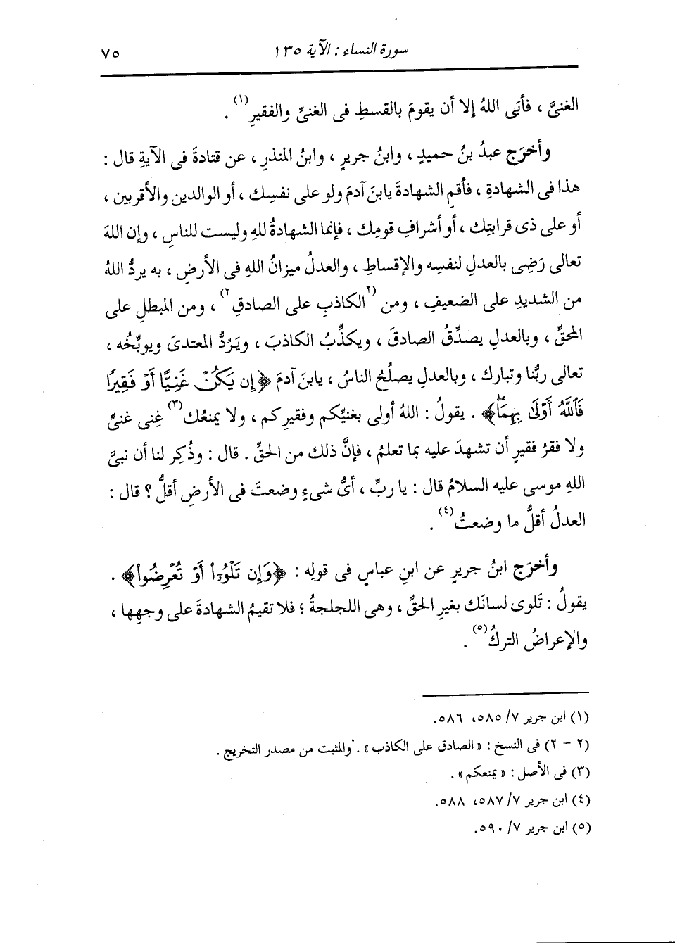وأخرج ابن جرير عن ابن عباس في قوله {وإن تلووا أو تعرضوا} يقول : تلوي لسانك بغير الحق وهي اللجلجة فلا يقيم الشهادة على وجهها ، والإعراض الترك