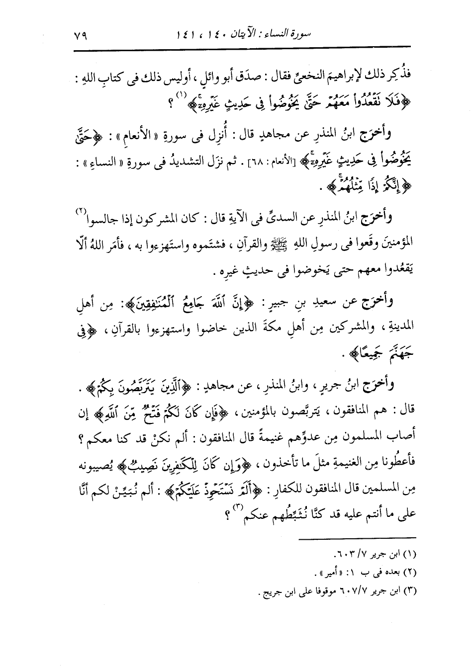 وأخرج ابن المنذر عن مجاهد قال : أنزل في سورة الأنعام (حتى يخوضوا في حديث غيره) (الأنعام الآية 68) ثم نزل التشديد في سورة النساء {إنكم إذا مثلهم}.