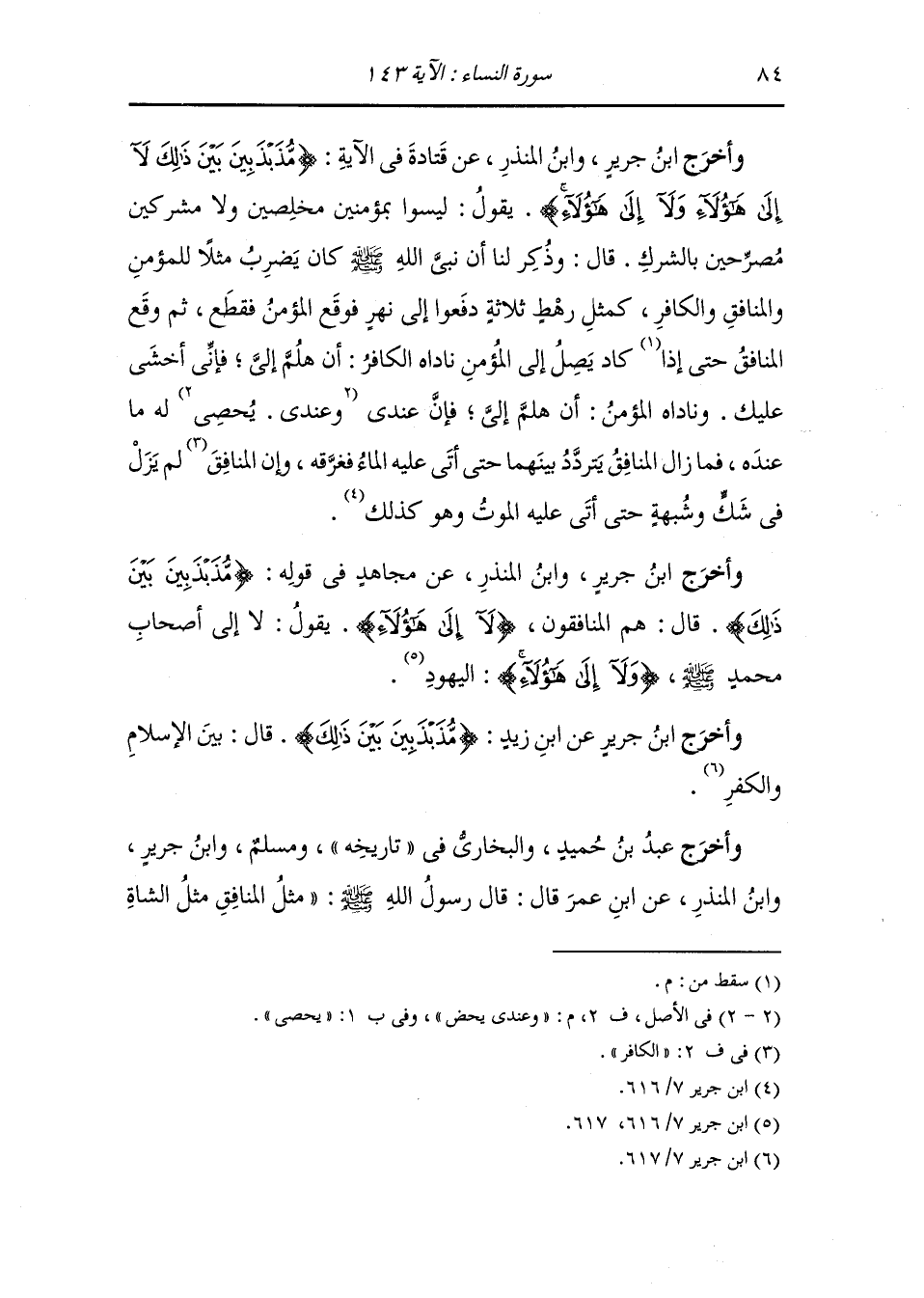 وأخرج ابن جرير ، وَابن المنذر عن قتادة في الآية {مذبذبين بين ذلك لا إلى هؤلاء ولا إلى هؤلاء} يقول : ليسوا بمؤمنين مخلصين ولا مشركين مصرحين بالشرك ، قال : وذكر لنا : أن نبي الله صلى الله عليه وسلم كان يضرب مثلا للمؤمن والكافر والمنافق كمثل رهط ثلاثة دفعوا إلى نهر فوقع المؤمن فقطع ثم وقع المنافق حتى كاد يصل إلى المؤمن ناداه الكافر : أن هلم إلي فإني أخشى عليك وناداه المؤمن أن هلم إلي فإن عندي وعندي يحصي له ما عنده فما زال المنافق يتردد بينهما حتى أتى عليه الماء فغرقه وإن المنافق لم يزل في شك وشبهة حتى أتى عليه الموت وهو كذلك.