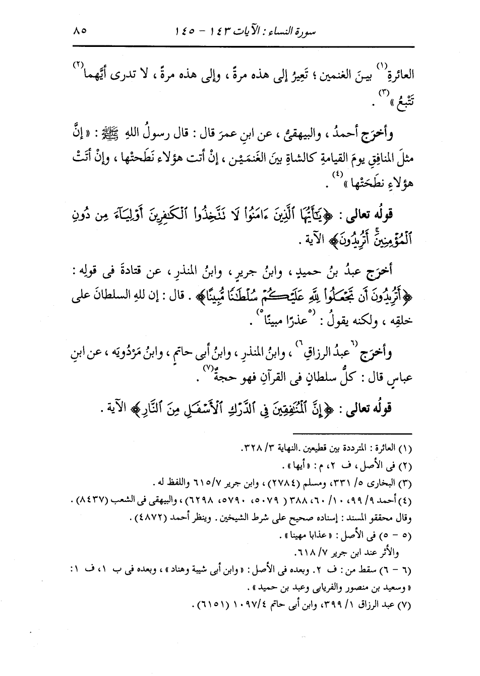 وأخرج أحمد والبيهقي عن ابن عمر قال : قال رسول الله صلى الله عليه وسلم : إن مثل المنافق يوم القيامة كالشاة بين الغنمين إن أتت هؤلاء نطحتها وإن أتت هؤلاء نطحتها.